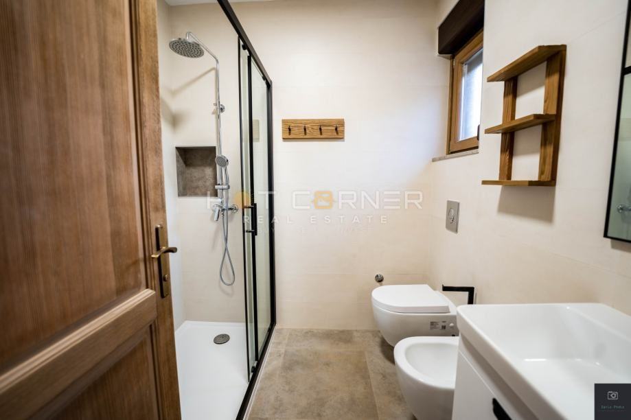 - Stan je opremljen kvalitetnim namještajem izrađenim po mjeri i kućanskim aparatima. Grijanje je podno u svim prostorijama, a hlađenje je rješeno klimom Mitsubishi. Stan ima i dimnjak s mogućnošću grijanja na peć na drva ili pelete.