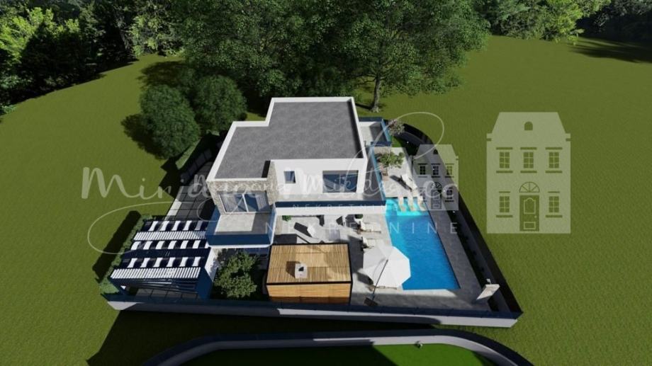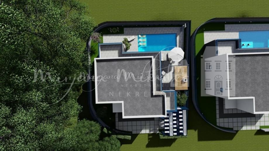 Okućnica ima 550 m2, dio terase je natkriveni, roštilj i ljetna kuhinja uz terasu,ostatak okućnice je popločen sa zelenim pojasom oko kuće uz ogradu, bazen 9x5 m ( grijani), vanjski tuš.