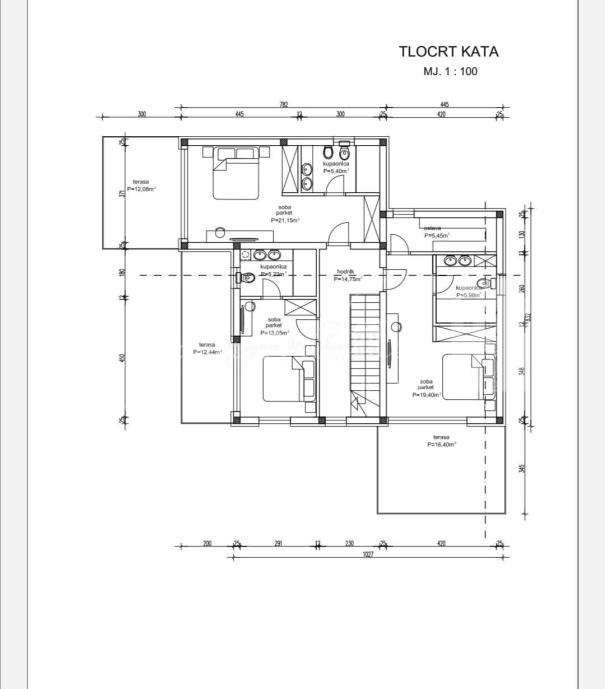 Na katu se nalazi: hodnik, 3 spavaće sobe sa vlastitim kupaonama i svaka soba ima izlaz na vlastitu terasu te ostava od 5,45 m2.