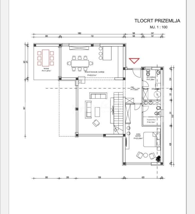 U prizemlju kuće se nalazi: hodnik, wc sa ostavom,velika spavaća soba ( 23m2) sa vlastitom kupaonom sa izlazom na terasu, kuhinja, blagovaonia i dnevni boravak otvorenog koncepta ( open space) ukupne kvadrature 62,61 m2 sa izlazom na terasu/dvorište te stepenice koje vode na kat.