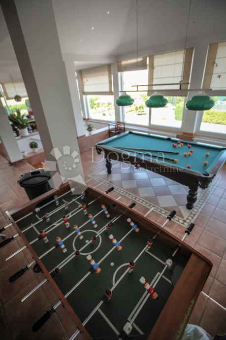 Eksterijer vile jednako je impresivan – tu su bazen, multifunkcionalni sportski teren (tenis, nogomet, košarka), sjenica s ljetnom kuhinjom, prostori za sjedenje i zabavu, te veliki parking za veći broj automobila.