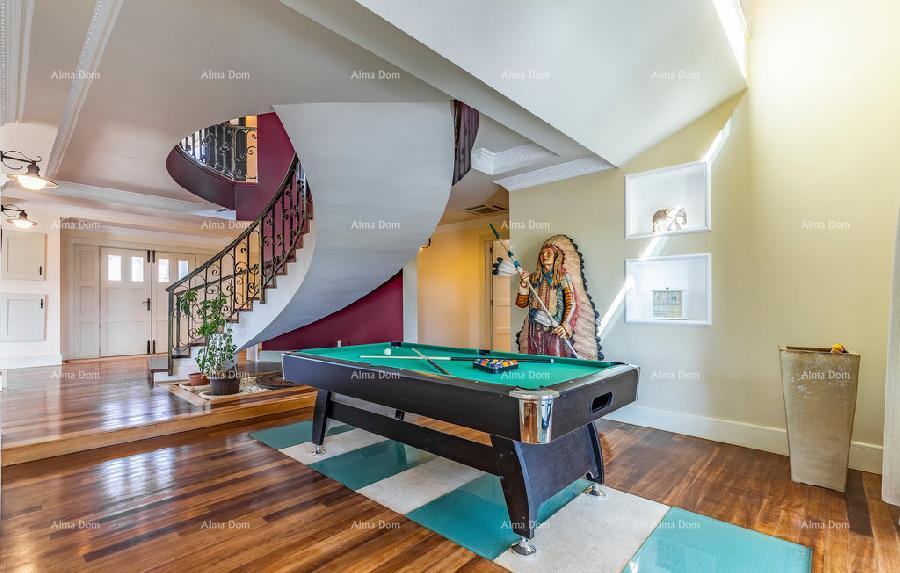 U prizemlju ville nalazi se prostran dnevni boravak sa biljarom i stolnim tenisom, kuhinja, ured, jedno kupatilo i stepenište koje vodi na kat.