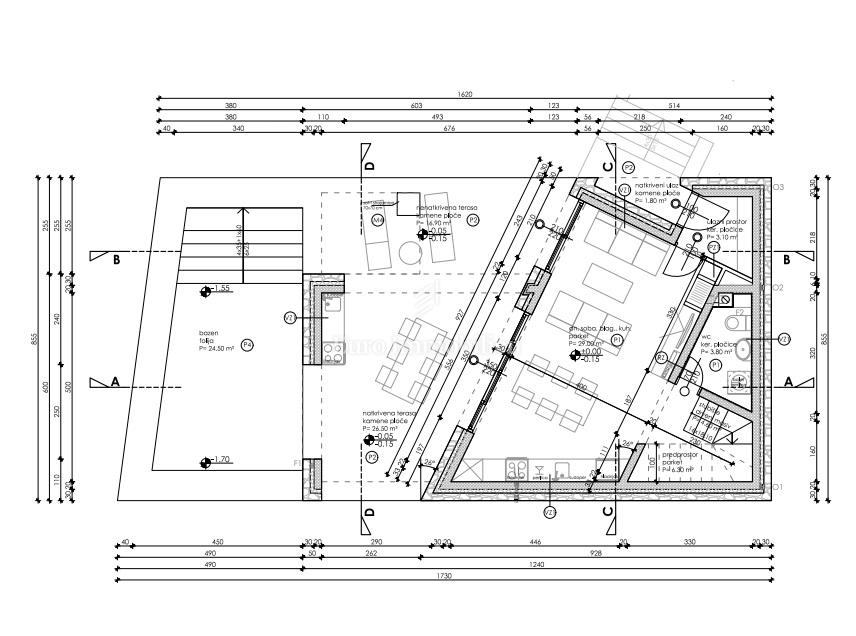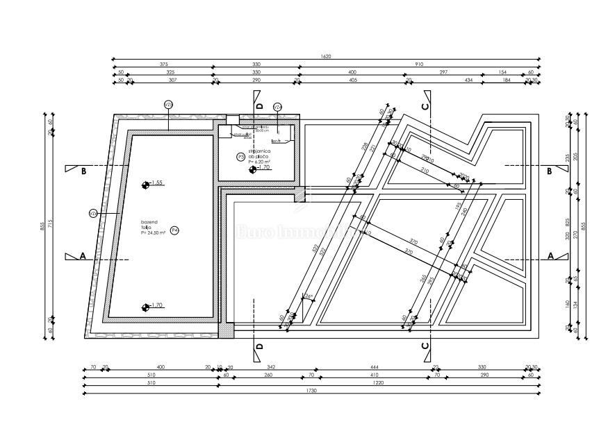 Prizemlje: dnevni boravak, kuhinja, blagovaonica, kupaonica, terasa, bazen
