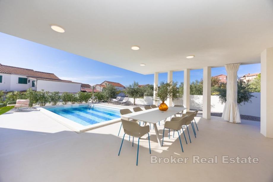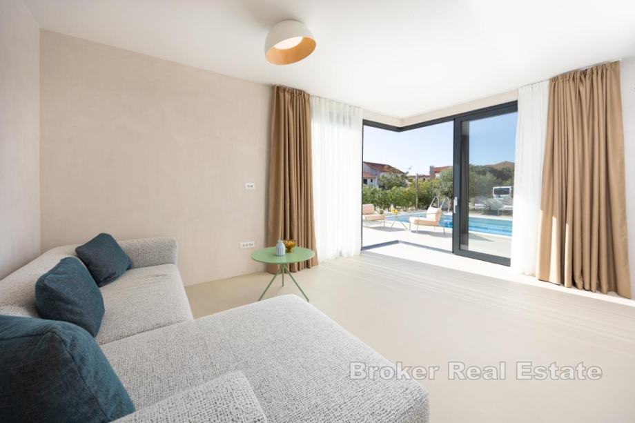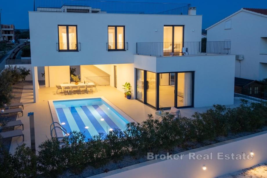 U malom turističkom mjestu, u blizini Rogoznice, prodaje se prekrasna vila s bazenom. Stambena površina od 340m2, raspoređena je na tri etaže, na parceli veličine 570m2.