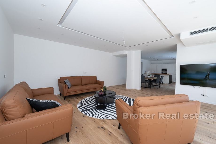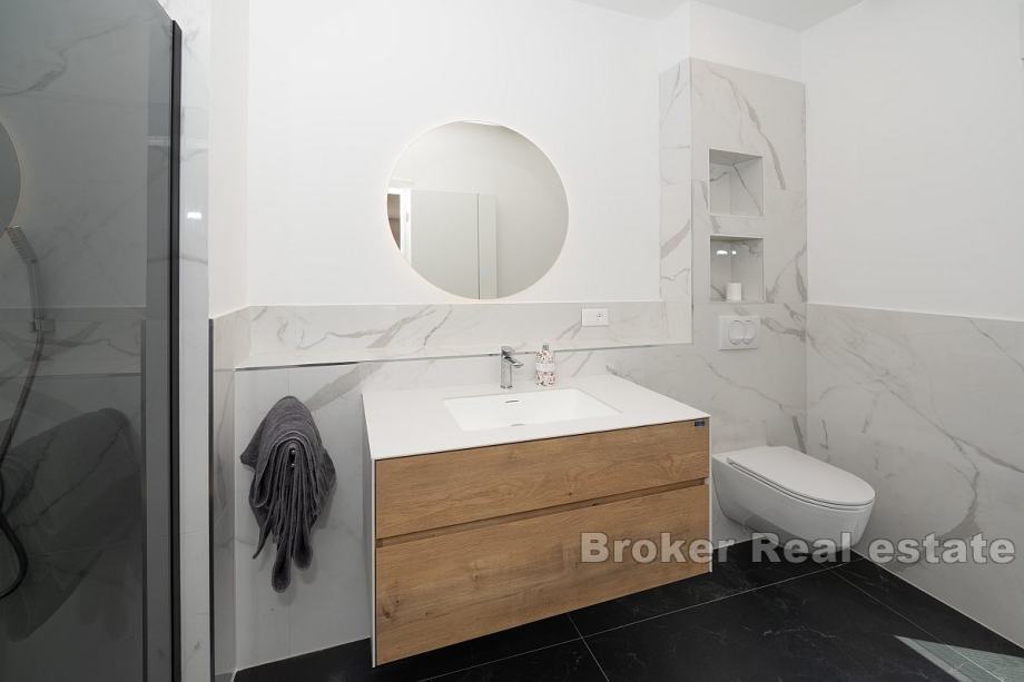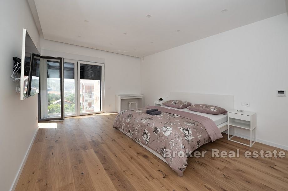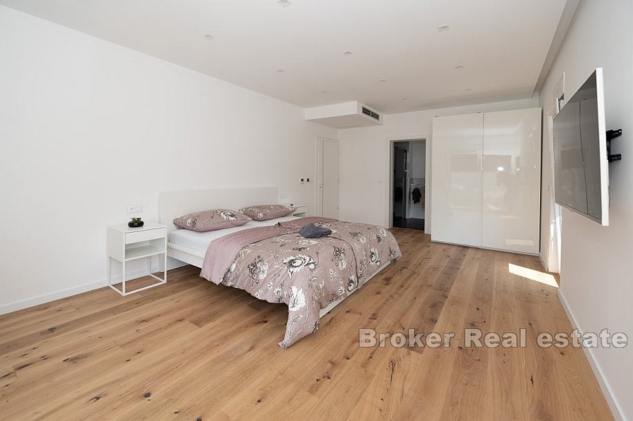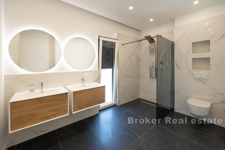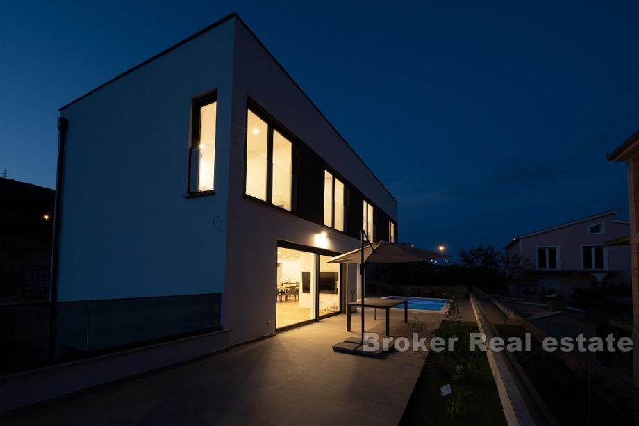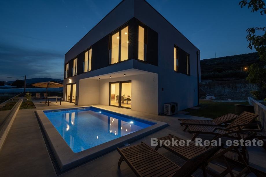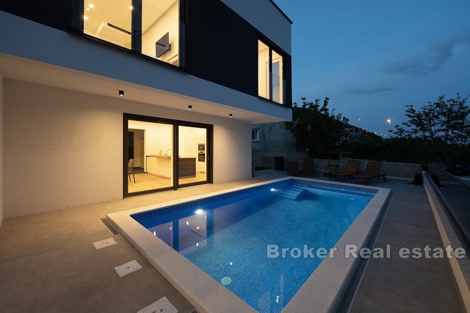 Prodaje se elegantna vila s bazenom, idealna za obiteljski život ili kao investicija za turistički najam. Ova prostrana kuća prostire se na tri nivoa – podrum, prizemlje i prvi kat, te nudi pametno organiziran prostor i suvremene sadržaje.U podrumu se nalazi garaža, strojarnica, pomoćni prostor te WC, osiguravajući dovoljno mjesta za skladištenje i tehničke potrebe. Prizemlje uključuje ulazni hodnik, kupaonicu, kuhinju i blagovaonicu, kao i prostrani dnevni boravak koji je idealan za druženje i opuštanje.Prvi kat obuhvaća hodnik, dvije kupaonice i četiri spavaće sobe, od kojih neke pružaju djelomičan pogled na more, čime se stvara ugodna atmosfera.Dvorište kuće opremljeno je bazenom, a također postoji i parking za više vozila, što dodatno povećava praktičnost ovog doma. Vila se nalazi samo 600 metara zračne udaljenosti od mora, a u neposrednoj blizini nalaze se trgovine, restorani i pekare. Ovo čini nekretninu savršenom za svakodnevni život kao i za turistički najam, pružajući sve potrebne sadržaje u blizini.