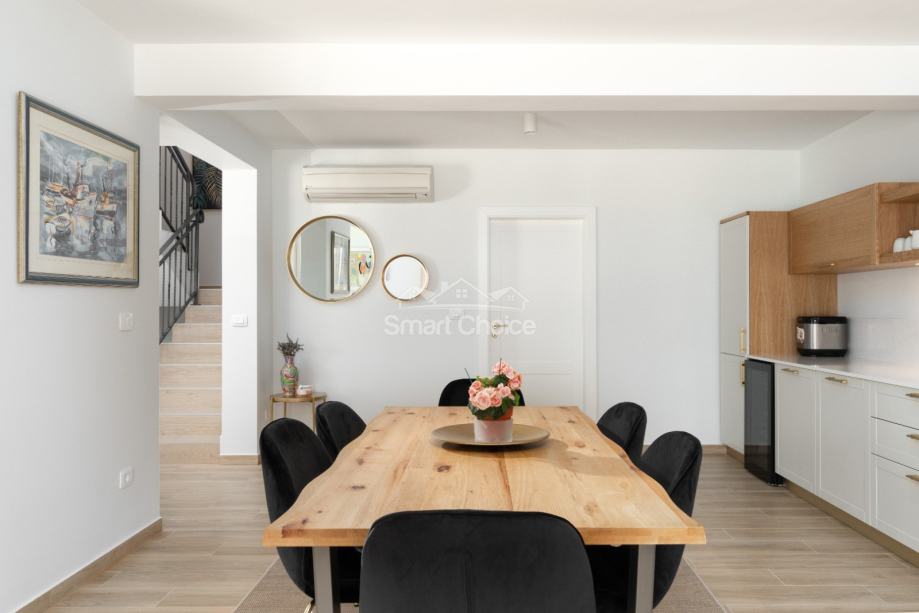 S tri spavaće sobe, ova kuća nudi dovoljno prostora za obitelj ili grupu prijatelja. Unutrašnjost je opremljena kuhinjom s aparatima, perilicom posuđa, perilicom rublja, televizorom, krevetom, kadom i radnim stolom, što osigurava udobnost i funkcionalnost. Klima uređaj i centralno grijanje dodatno doprinose ugodnom boravku tijekom cijele godine.