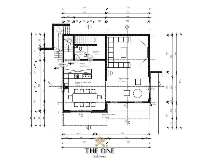 Donji kat sadrži kuhinju i blagovaonicu sa staklenim kliznim stijenkama koje se otvaraju na terasu. Prostrana dnevna soba nudi nesmetan pogled na infinity bazen i more. Pored spremišta se nalazi gostinjski wc kojeg je moguće prenamijeniti u kupaonicu.