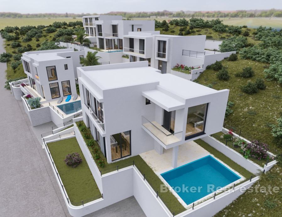 Villa K2 s bazenom površine 35m2, smještena u atraktivnom kompleksu od pet vila, u jednom od najprivlačnijih mjesta uz obalu. Izgrađena na parceli od 405 m2, minutu do mora i plaže. Sastoji se od dvije etaže ukupne stambene površine 165,50 m2 , tehničke prostorije od 10 m2 i suterenskog dijela površine 49,80 m2. U suterenu je smještena dupla garaža i tehnička prostorija.