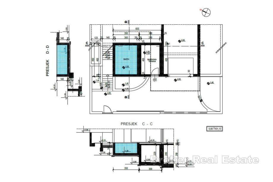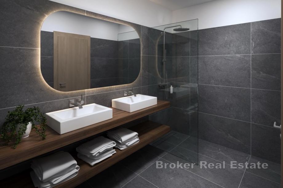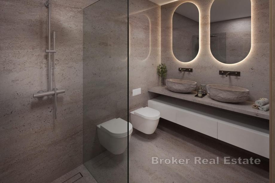 Interijer je izveden u skladu s najvišim standardima – vrhunska keramika pažljivo je birana za svaki prostor, podno grijanje osigurava ugodnu klimu tijekom cijele godine, a aluminijska stolarija u antracit boji pruža izvrsnu toplinsku i zvučnu izolaciju te dodatnu estetsku vrijednost.