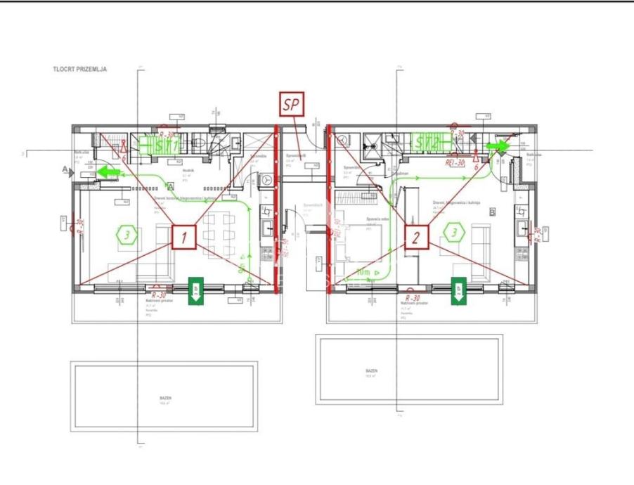 Prizemlje se sastoji od ulaznog hodnika, gostinjskog WC-a, vešeraja/spremišta, te kuhinje, blagovaone i velikog dnevnog boravka po open space konceptu, iz kojeg se može izaći u dvorište gdje se nalazi sunčalište sa bazenom 24m2.