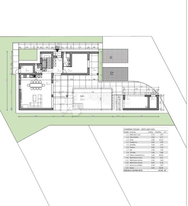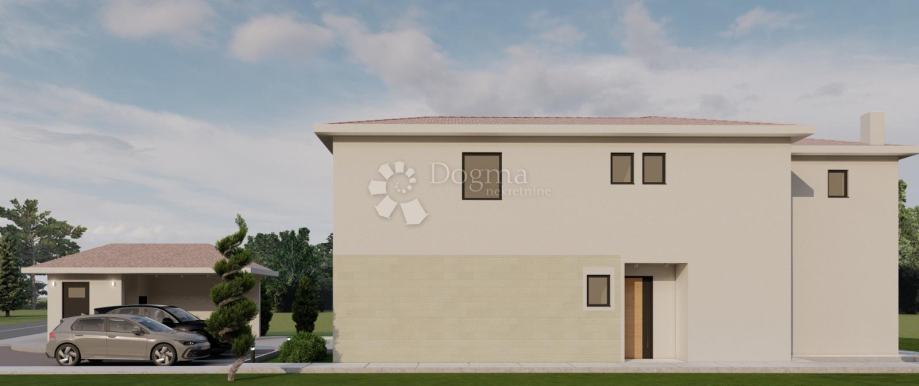 Prizemlje (88,99m2) se sastoji od ulaznog hodnika, prostranog dnevnog boravka sa kuhinjom i blagovaonicom, spavaće sobe sa kupaonicom, wc-a, tehničke prostorije te stepeništa koje vodi na prvi kat. Na prvom katu (86,68m2) nalaze se 3 spavaće sobe svaka sa svojom kupaonicom te izlazom na terasu. Dvorište se sastoji od bazena sa sunčalištem, ljetne kuhinje i 2-3 parkirna mjesta.