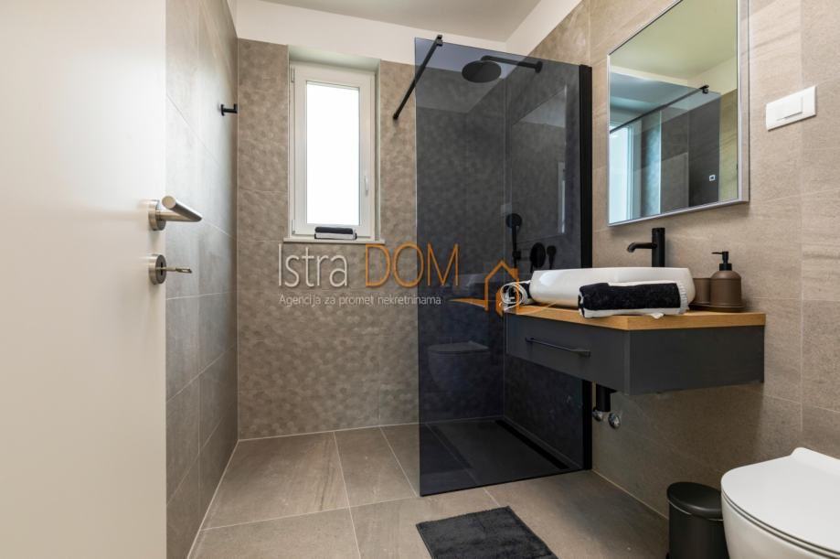 Na prodaju nudimo impresivnu vilu smještenu u mirnom okruženju, okruženu zelenilom i maslinama. Ova novogradnja, koja se nalazi na parceli od 890 m², pruža savršen spoj udobnosti i moderne tehnologije.