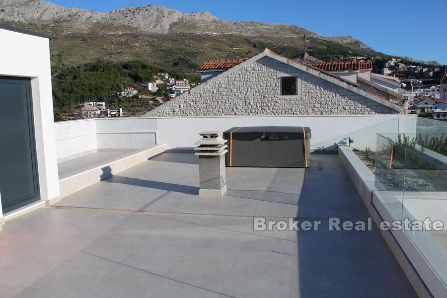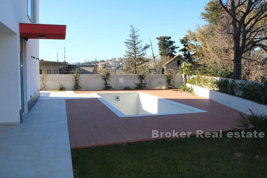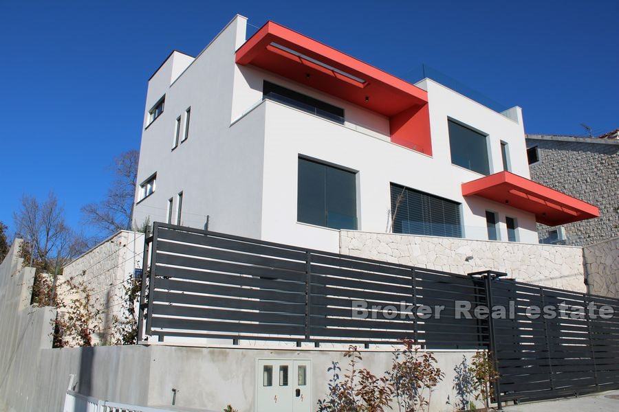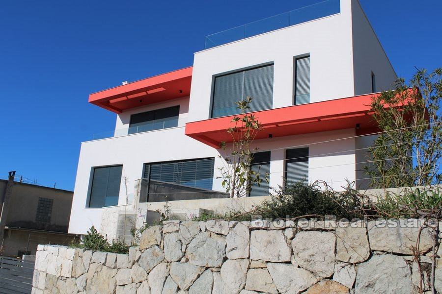 U prizemlju se nalazi garaža iz koje se ulazi direktno u kuću i apartmana koji je nedovršen te se sastoji od kupaonice, dnevnog boravka, kuhinje i jedne sobe. Prvi kat se sastoji od dnevnog boravka, 1 sobe, kuhinje s blagavaonicom, kupaonicom, velikom vrtnom terasom i bazenom. Na drugom katu se nalaze 3 spavaće sobe, kupaonica, terasa s pogledom na more. Na vrhu kuće se nalazi velika terasa s masažnom kadom s koje se pruža otvoreni pogled na more.