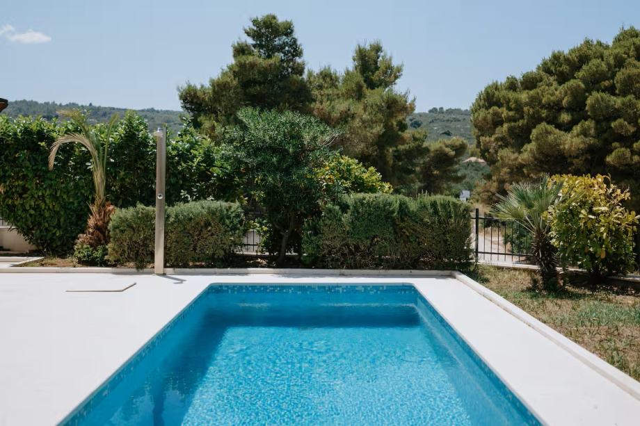 Uredan vrt i okućnica s Velikom terasom na kojoj se nalazi bazen dimenzija 3 x 8 m.