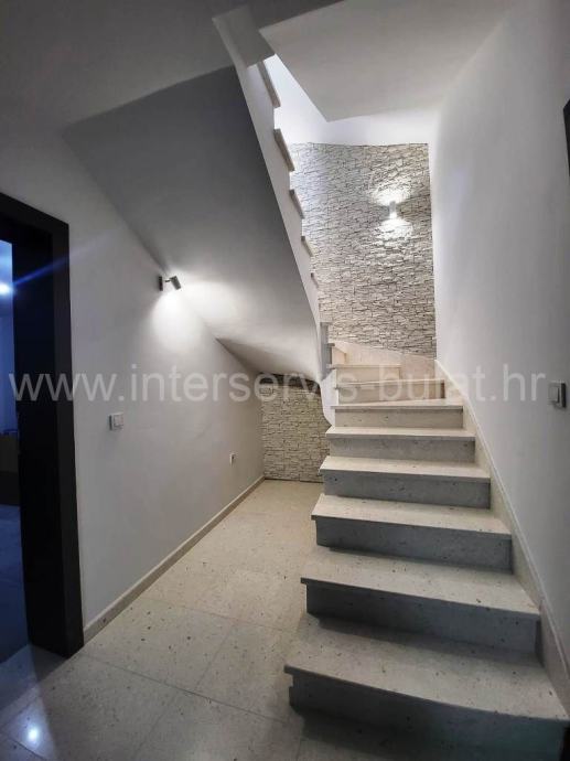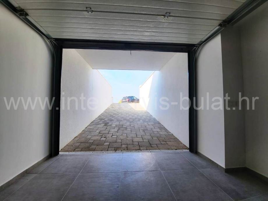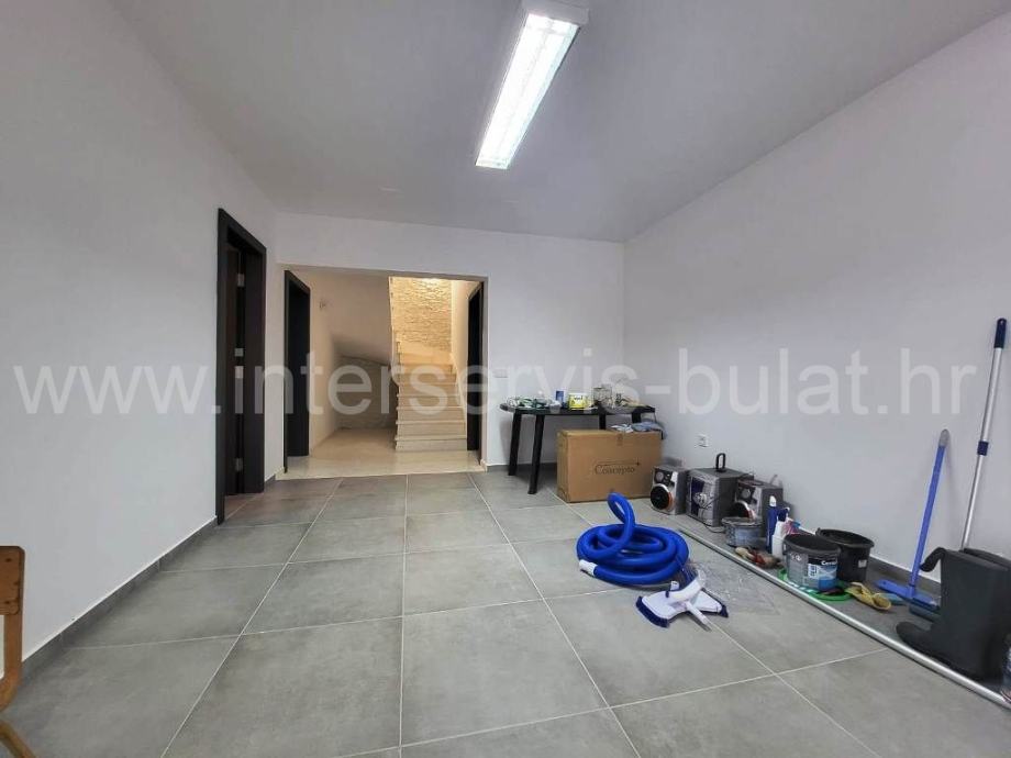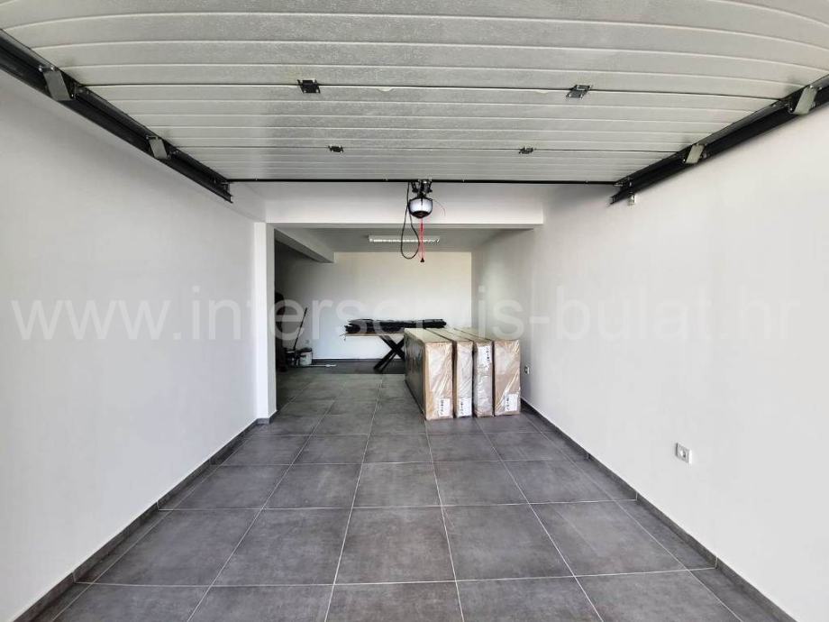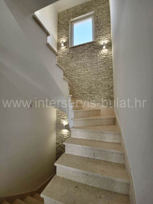 U podrumu površine cca 132m2 nalazi se velika garaža i 3 prostorije (tehnička soba, soba za saunu i soba za kino). Garaža i podrum povezani su unutarnjim stubištem s gornjim etažama. U prizemlju se nalazi otvorena kuhinja s blagovaonicom i dnevnim boravkom, ulazni prostor i kupaonica. Kroz kuhinju i dnevni boravak dolazimo do vanjske natkrivene terase gdje se nalaze: bazen dimenzija 8m x 3,5m s hidro masažom, vanjski tuš, roštilj i lijepa terasa s očaravajućim pogledom na more.