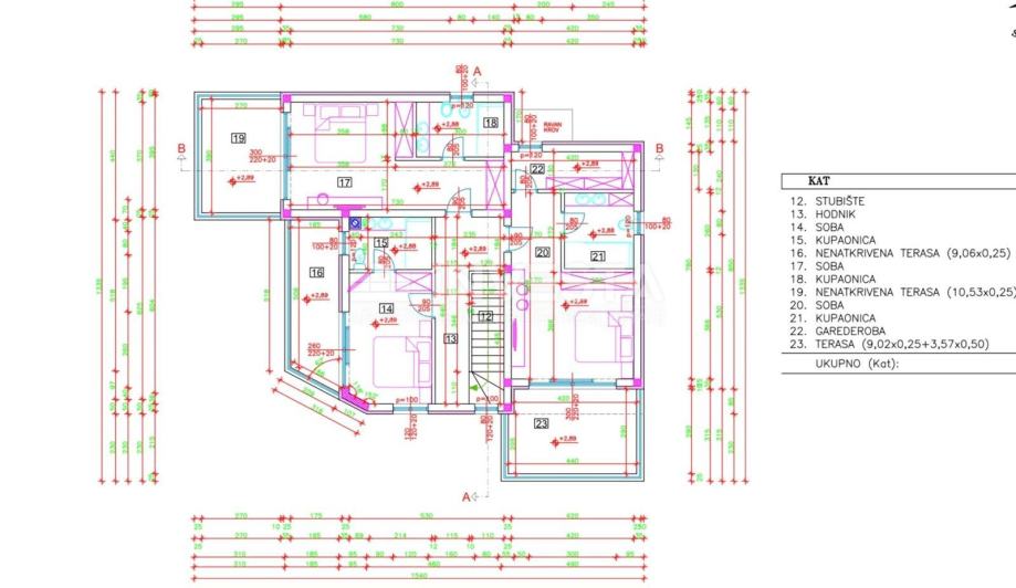 Na katu su smještene tri spavaća sobe svaka sa svojom kupaonicom i natkrivenom terasom.