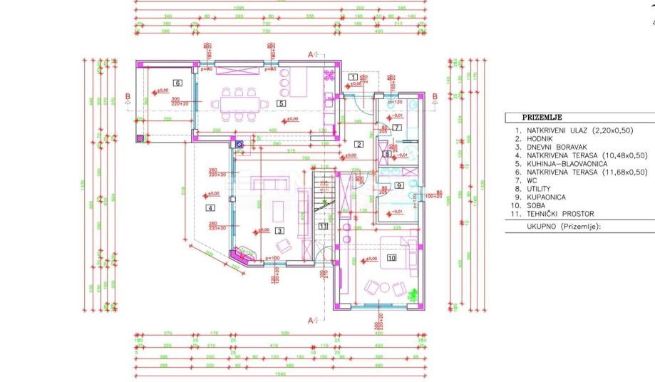 U prizemlju se nalazi natkriveni ulaz, prostrani dnevni boravak sa izlazom na veliku natkrivenu terasu koja gleda na bazen i sunčalište, kuhinja sa blagovaonicom, jedna spavaća soba sa kupaonicom, toalet , utility i tehnička soba.