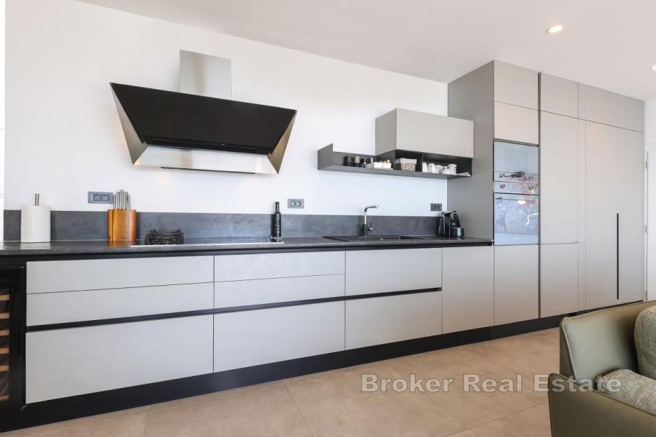 Na zemljištu površine 603 m² smještena je vila ukupne stambene površine 255 m², raspoređena na tri etaže. U prizemlju se nalaze garaža, fitness prostor i konoba, dok je na prvom katu smješten studio apartman površine 37 m² te dvije spavaće sobe s kupaonicom. Drugi kat obuhvaća dnevni boravak povezan s kuhinjom i blagovaonicom iz kojih se izlazi na terasu, spavaću sobu s vlastitom kupaonicom, ostavu i garderobu. S iste etaže osiguran je izravan pristup sunčalištu i bazenu, a u stražnjem dijelu kuće smješten je roštilj s kutkom za djecu. Na okućnici se nalaze i tri vanjska parkirna mjesta. Vila je luksuzno uređena i opremljena vrhunskim sadržajima. Ističe se infinity bazen s hidromasažom, moderna Scavolini kuhinja i Schüco aluminijska stolarija, a dodatnu sigurnost pruža videonadzor. Grijanje i hlađenje riješeno je sustavom fancoilera Daikin te podnim grijanjem kroz cijelu kuću, osim u spavaćim sobama. Podne obloge izvedene su u kombinaciji keramike i parketa, što prostoru daje eleganciju i toplinu. Zahvaljujući svojoj lokaciji i pogledu na Kvarnerski zaljev i Opatiju, ova nekretnina pruža spoj luksuza, udobnosti i funkcionalnosti.