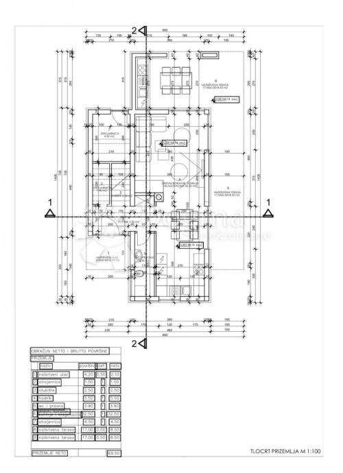 Kuća se sastoji od prizemlja i prvog kata. U prizemlju ćete pronaći prostrani ulazni hodnik koji vodi do WC-a s praonicom, moderne kuhinje s blagavaonicom te velikog dnevnog boravka koji se otvara na prekrasnu natkrivenu terasu i bazen, savršenu za opuštanje i zabavu na otvorenom.