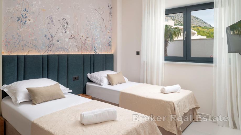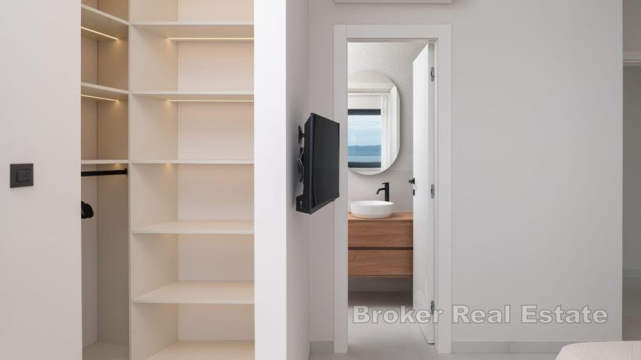 Nekretnina stambene površine 220 m2 nalazi se na zemljištu površine 605 m2, a sastoji se od suterena, prizemlja i kata. Prizemlje se sastoji od otvorenog koncepta kuhinje s blagovaonicom, dnevnog boravka, ostave, jedne spavaće sobe i kupaonice. Iz dnevnog boravka se izlazi na natkrivenu terasu koja vodi do infinity bazena i pruža otvoreni pogled na more. Unutarnje stepenice vode na kat gdje se nalaze tri spavaće sobe sa pripadajućim kupaonicama, sa lođom i terasom.