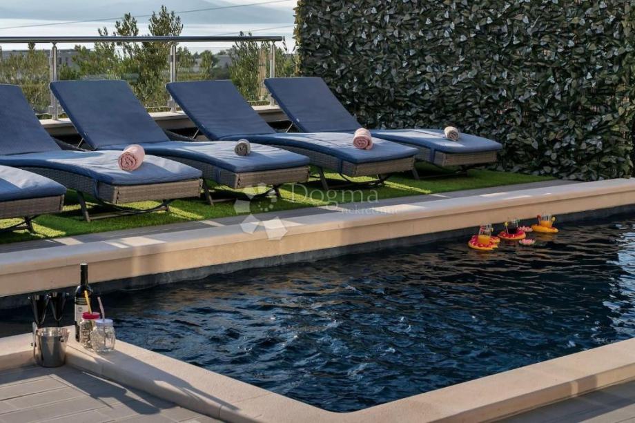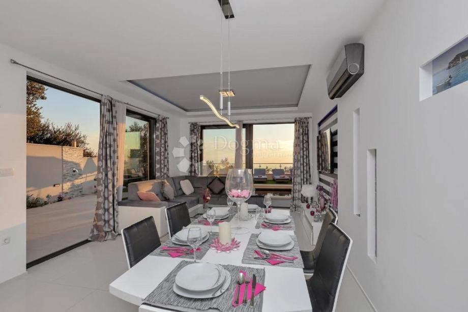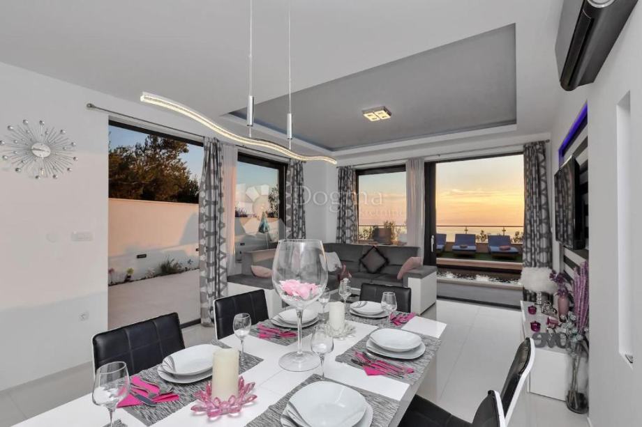 U prizemlju se nalazi ulazni dio koji vodi u prostrani dnevni boravak otvorenog koncepta s moderno opremljenom kuhinjom i blagovaonicom. Prostor je orijentiran prema moru i prirodno se nastavlja na veliku terasu s grijanim bazenom dimenzija 2,5 x 8,5 m.