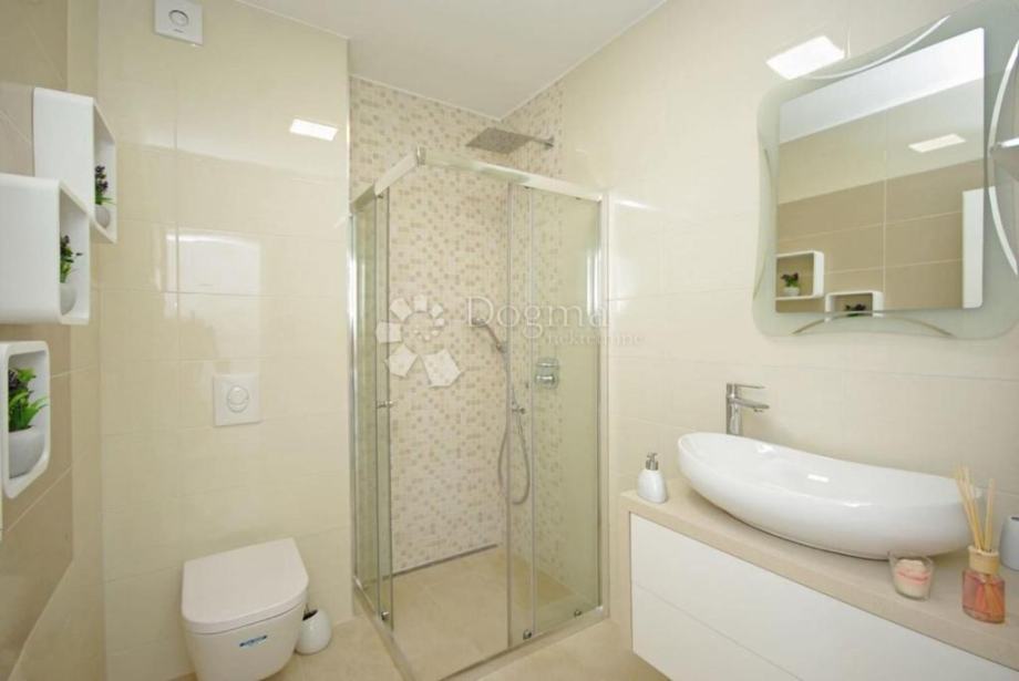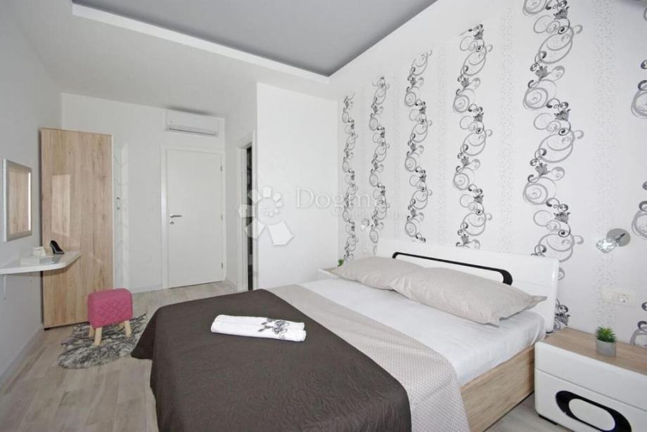 Na istoj etaži smještena je i spavaća soba s vlastitom kupaonicom i direktnim izlazom na terasu, dodatna kupaonica te prostor za boravak na otvorenom — kombinacija natkrivenog i nenatkrivenog dijela s roštiljem, vanjskim tušem i ležaljkama.