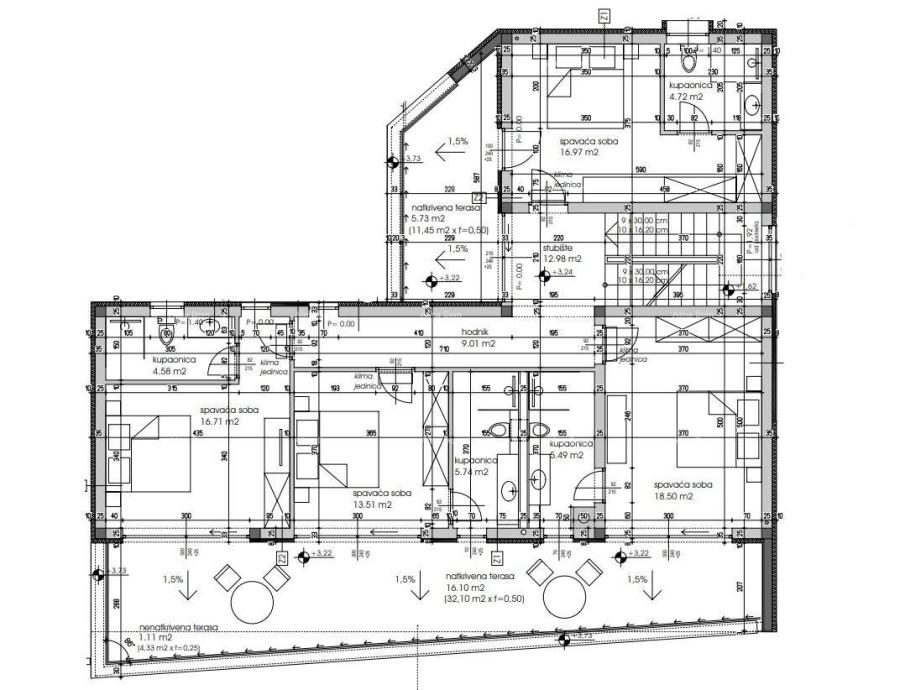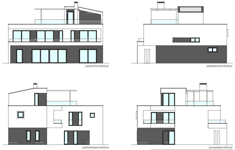 Na prvom katu nalaze se četiri spavaće sobe sa pripadajućim kupaonicama, hodnik, natkrivena I nenatkrivena terasa.