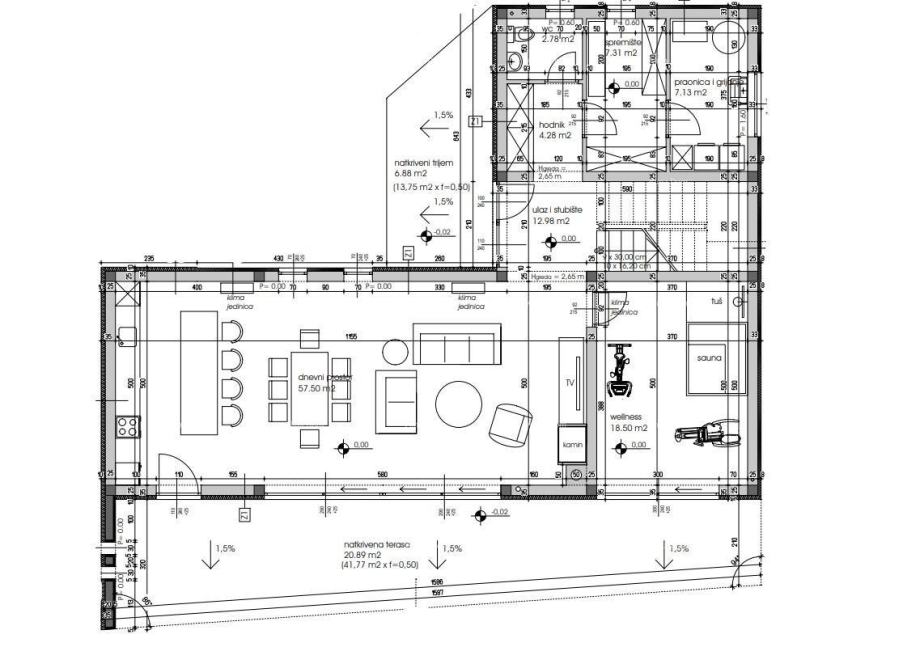 U prizemnom dijelu građevine nalazi se natkriveni trijem, hodnik, wc, praonica, prostor grijanja/spremište, wellness, dnevni prostor, prostor stubišta i natkrivena terasa.