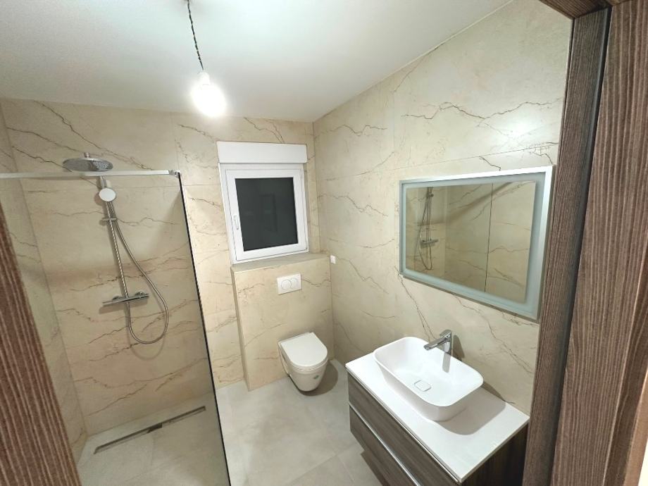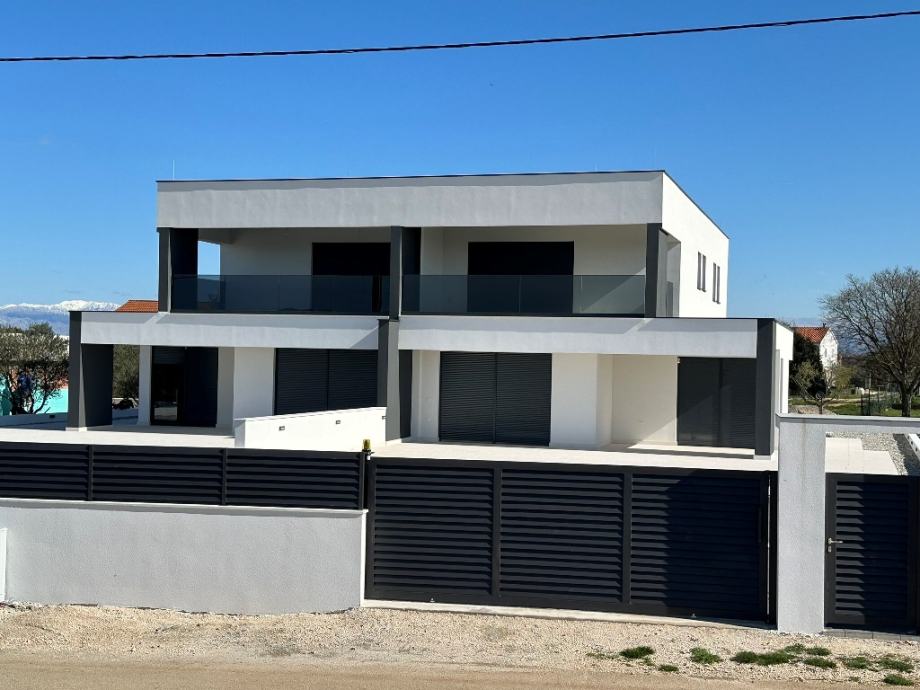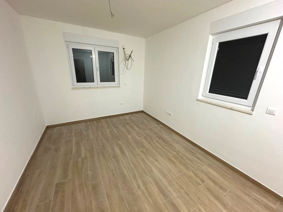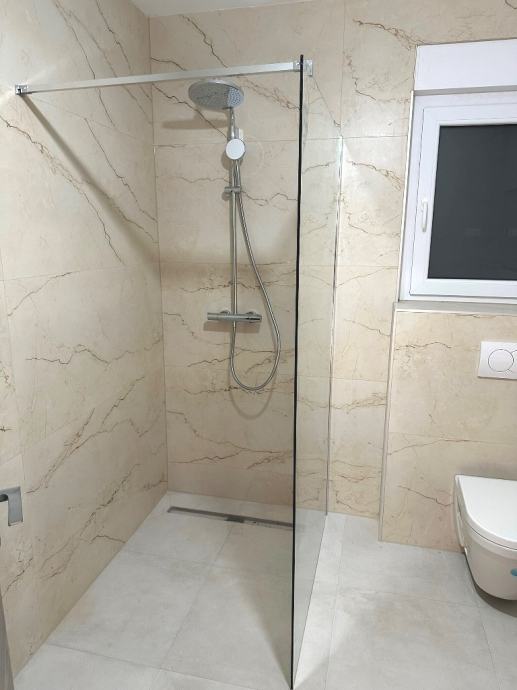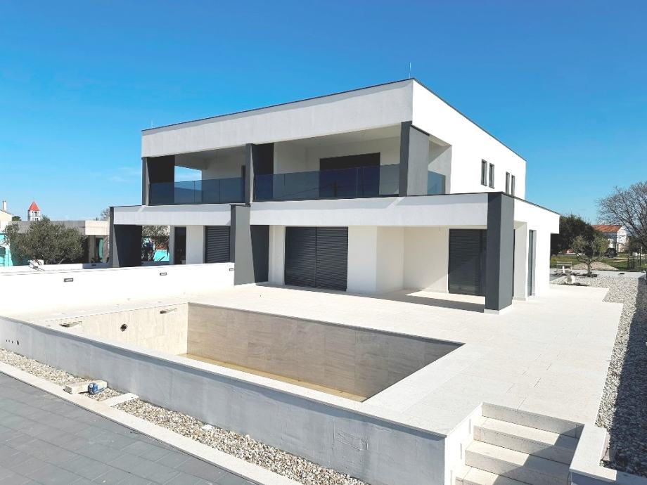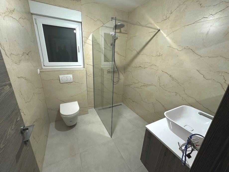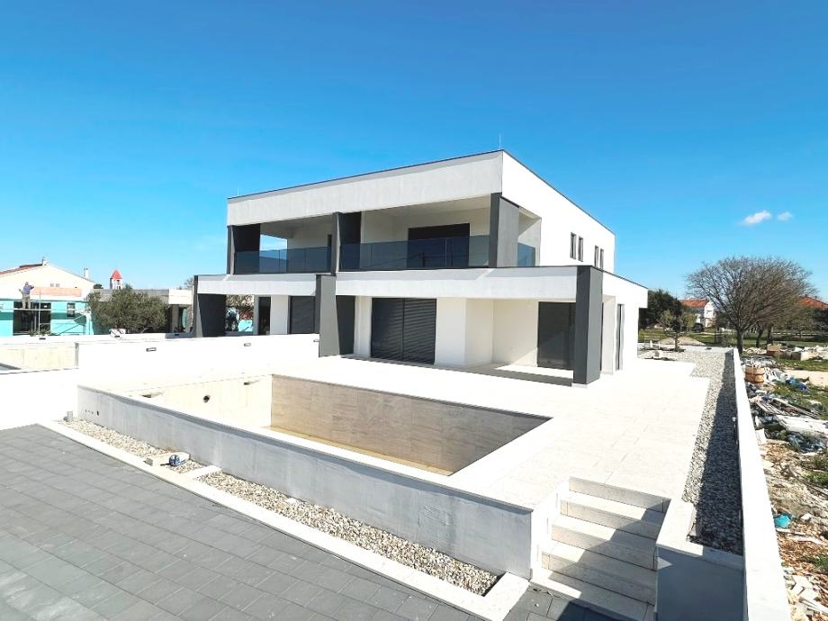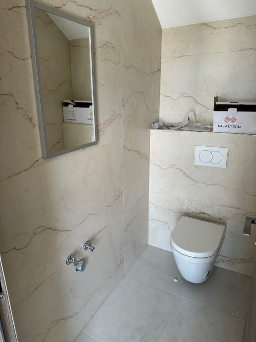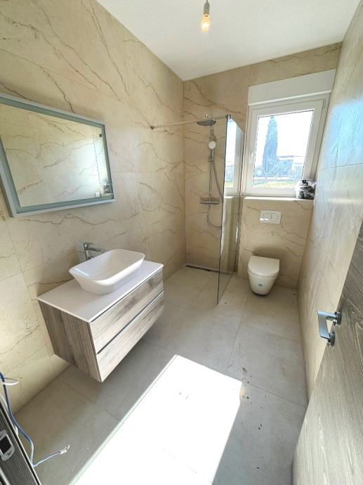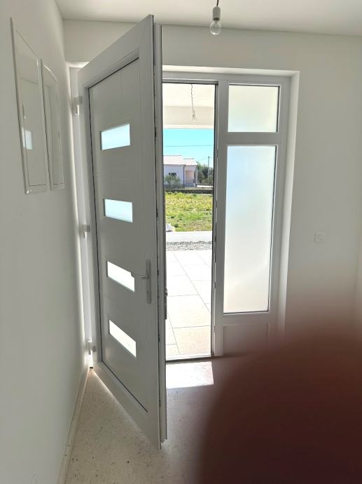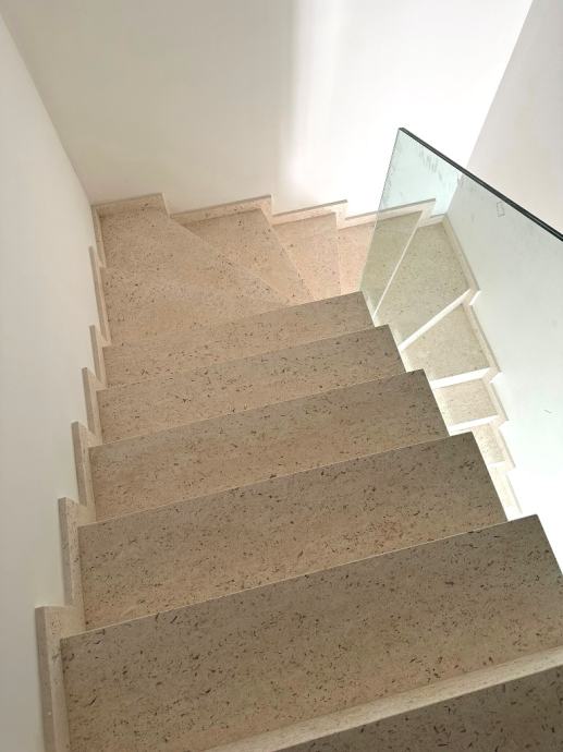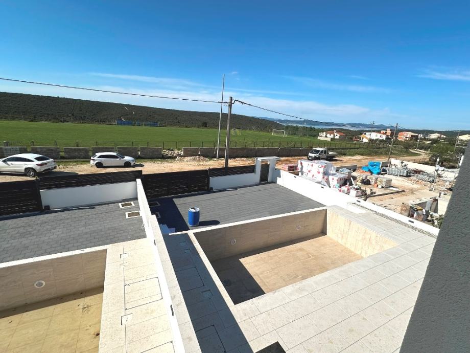 U ponudi je ostala još jedna (lijeva) vila a sastoji od prizemlja u kojem je smještena kuhinja sa blagavaonicom i boravkom (50m2), kupaonica, jedna spavaća soba, praonica (može se napraviti i sauna) te spremište. Iz boravka se izlazi na natkrivenu tersau i dvorište u kojem je smješten prelivni bazen (32m2) te uređena hrtikultura. Na katu su smještene tri spavaće sobe sa dvije kupaonice, prostrana terasa. Vila je namještena i odmah useljiva. Projektirani objekt je armirano-betonski, sa unutarnjim pregradama od cigle ili dvostrukog knaufa (prema zahtjevu ili potrebama). Visokakvaliteta gradnje i opremanja vile (sustavi grajanja/hlađenja u svakoj prostoriji, podna grijanja u kupaonicama, talijanska keramika 1.klase, u sobama hrastov parket, vanjska alu stolarija sa komarnicima i rolatama, prilivni bazen sa urđenim okolišem), spoj na električnu energiju i vodovod, dodatna podzemna gusterna za oborinsku vodu (mogućnost za zalijevanje okoliša, punjenje bazena a uz filtere mogućnost vode u cijeli objekt), privatni pristup i parkiralište . Prilaz sa asfaltne ceste. Vlasništvo i dokmentacija uredni.