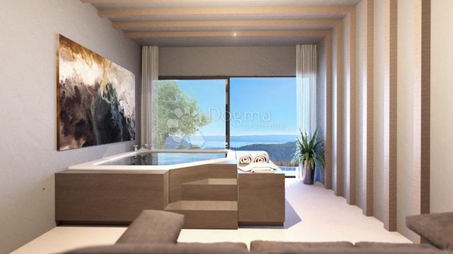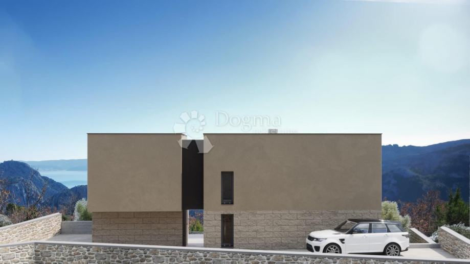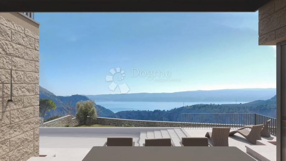 Na uzvisini iznad Omiša, u mirnoj slijepoj ulici koja jamči potpunu privatnost i tišinu, smjestila se ova ekskluzivna moderna vila s otvorenim panoramskim pogledom na Omišku Dinaru i Brački kanal.