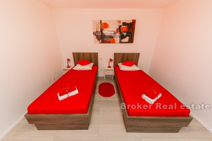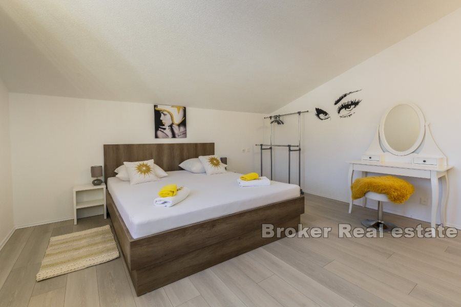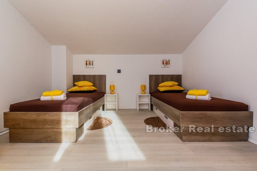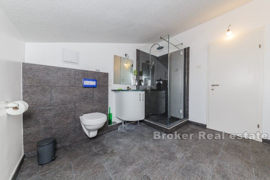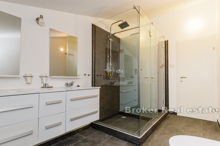 U prizemlju se nalaze i tri udobne spavaće sobe, svaka prostrana i pažljivo uređena, kao i dvije luksuzne kupaonice i dodatni toalet za praktičnost. Prizemlje je savršeno za opuštanje i zabavu, s velikim otvorenim prostorima koje krase profinjeni detalji i topli tonovi.