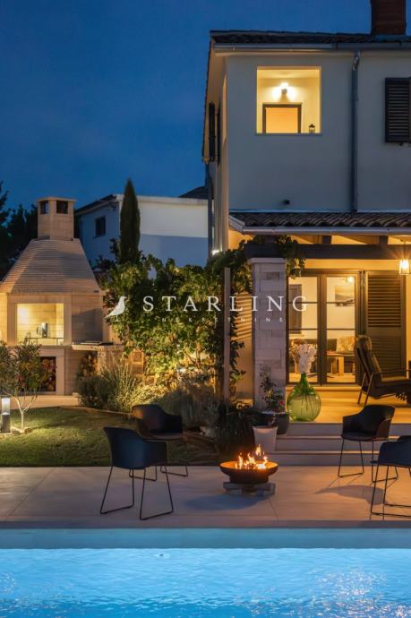 VANJSKI PROSTOR: 5 privatnih parkirnih mjesta (nadstrešnica za dva vozila), natkriveni ulaz u kuću/trijem, 1 natkrivena terasa (30 m²), grijani bazen (50 m²), sunčalište uz bazen (150 m²), igralište za djecu (ljuljačke, tobogan), vrtna kućica (za alat i skladištenje), vanjska kuhinja s roštiljem od kanfanarskog kamena, 1,000 m² uređen vrt.