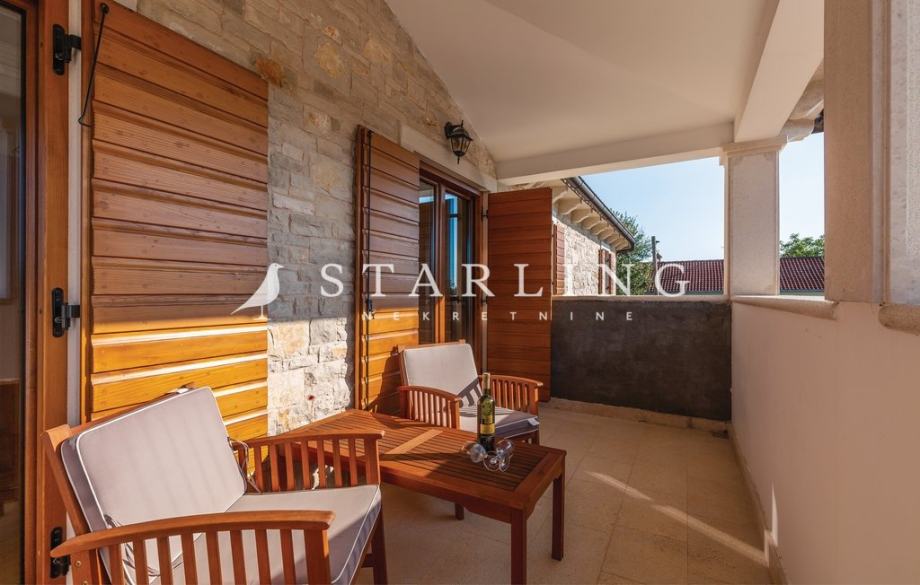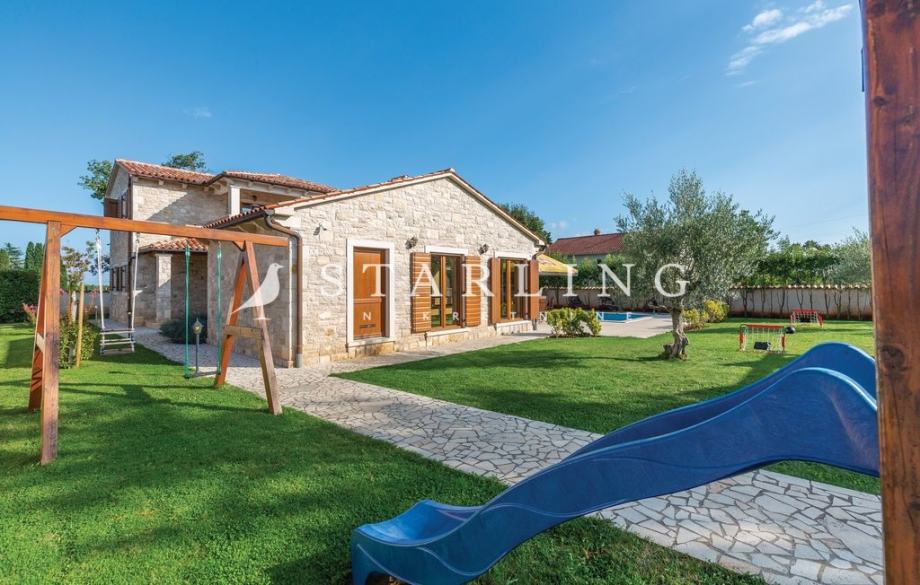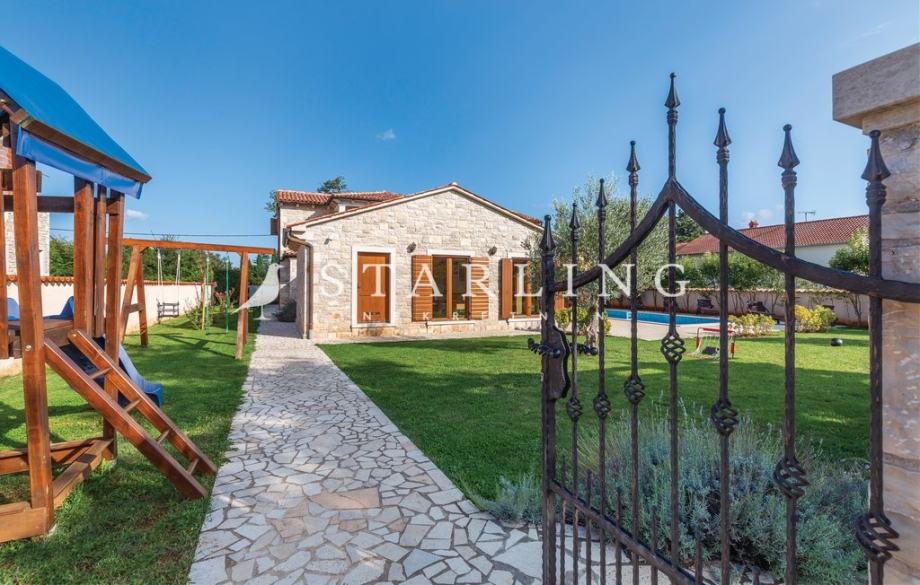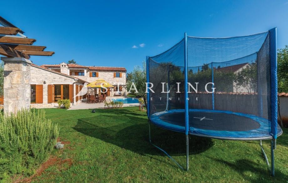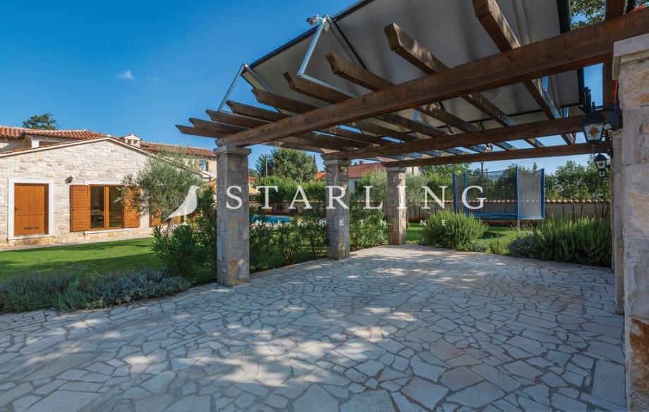 - OKUĆNICE: ograđena okućnica kamenim zidom, natkriveni parking za 2 vozila, bazen površine 45 m2 sa sunčalištem, terasa natkrivena pergolom površine, uređena travnata površina.