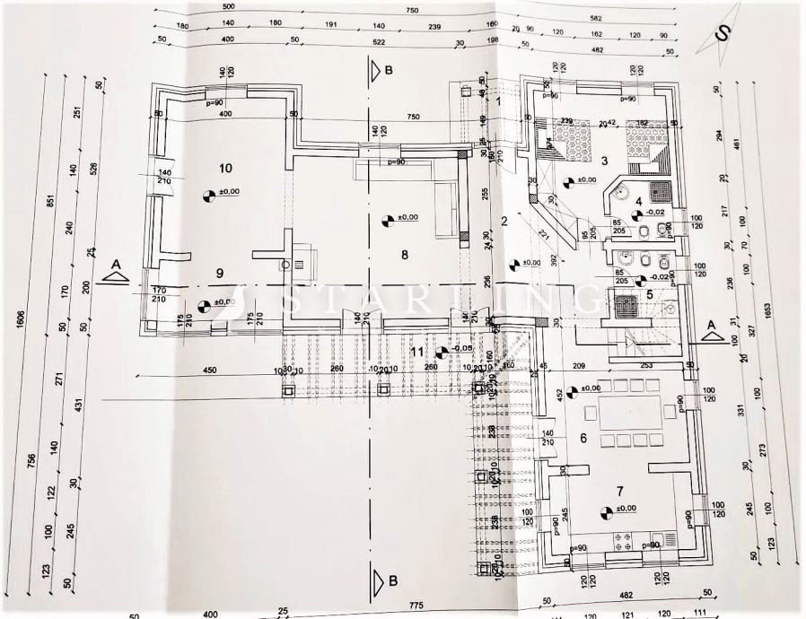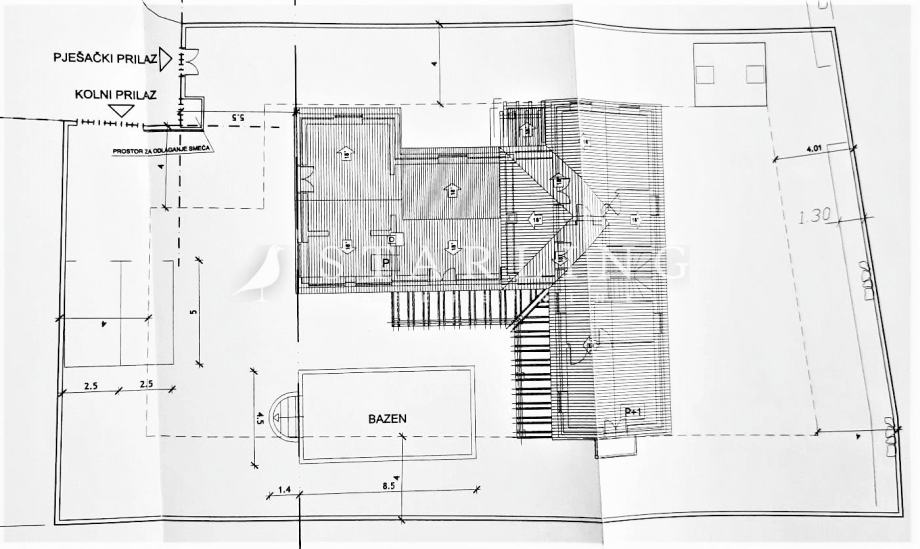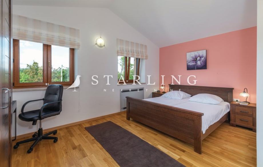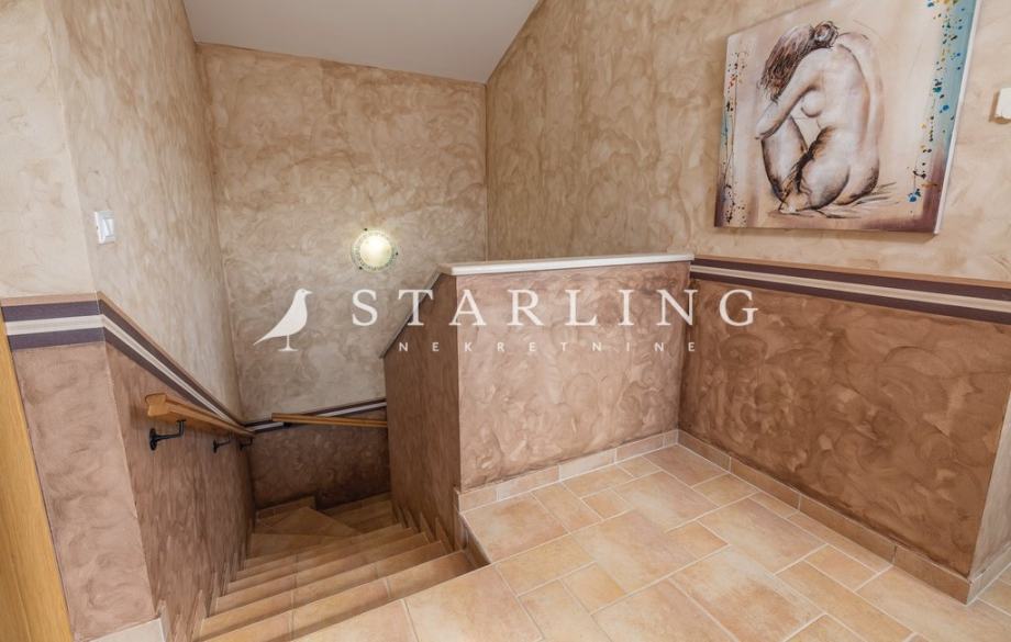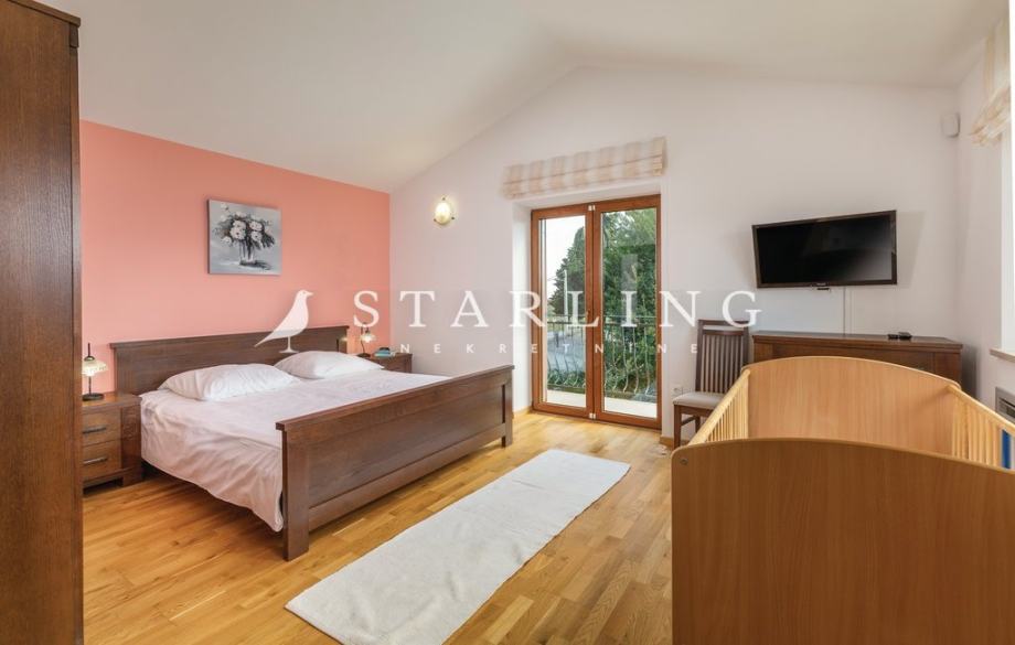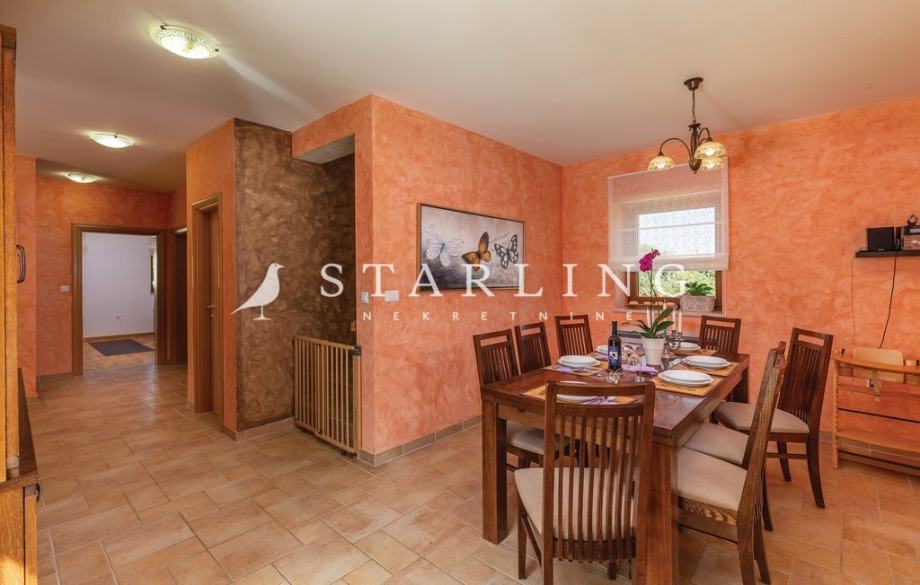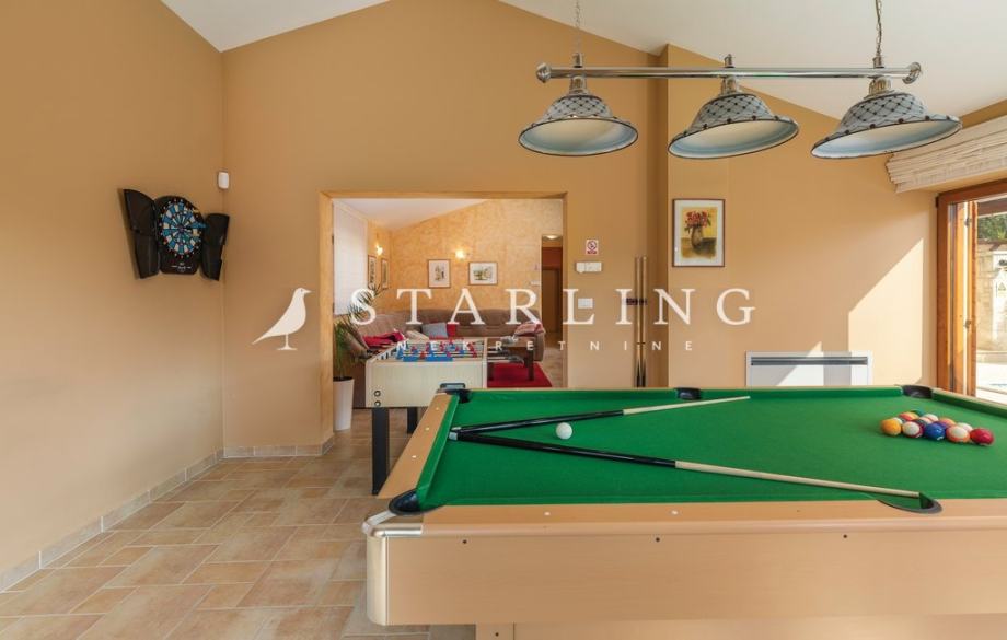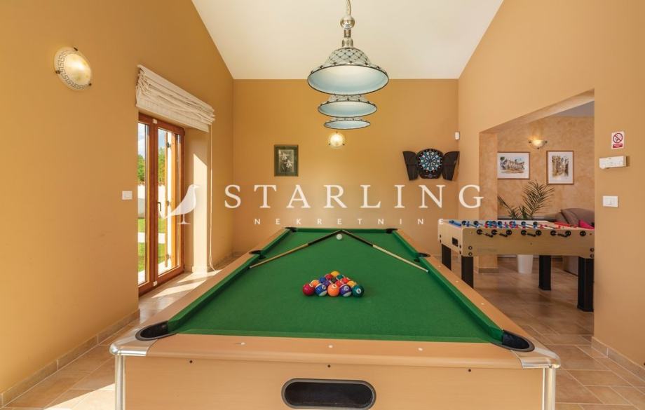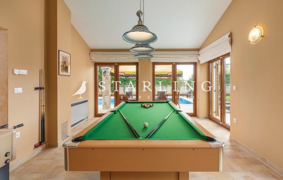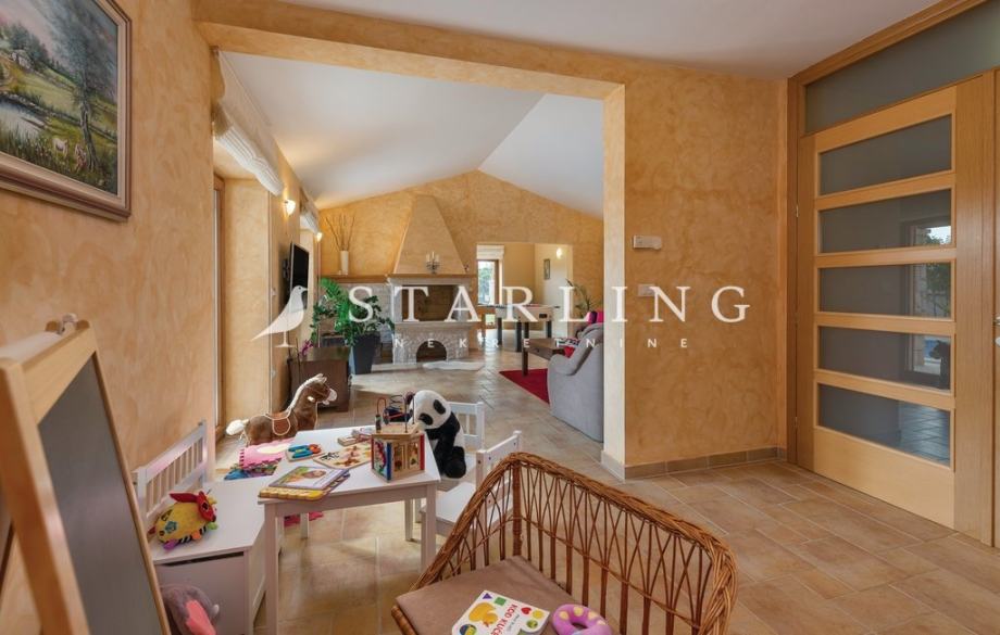 - PRIZEMLJA: kuhinja s blagovaonicom, prostrani dnevni boravak s izlazom na terasu bazena, wc, spavaća soba, kupaonica, ostava, igraonica.