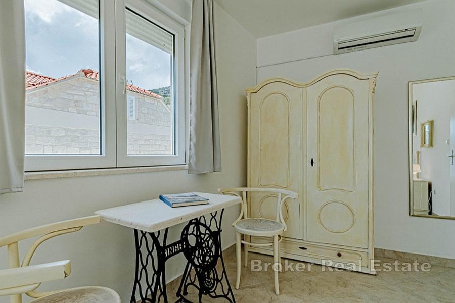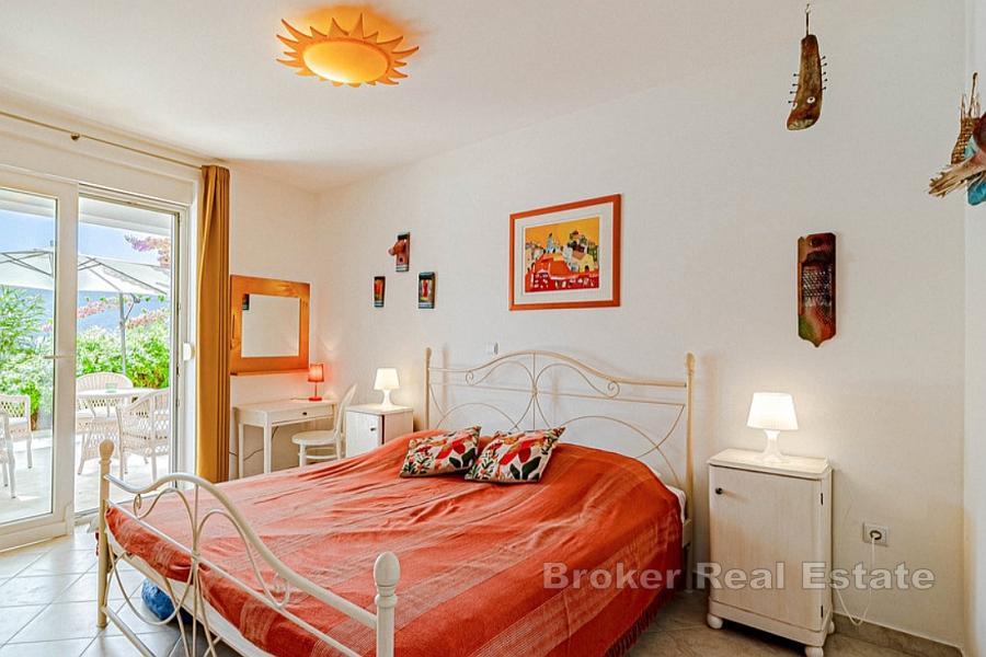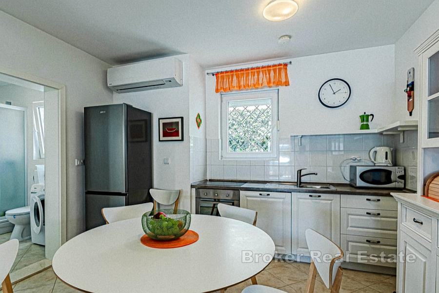 Kuća je kompletno luksuzno opremljena, a prizemlje se sastoji od spavaće sobe južne orijentacije s izlazom na terasu (20m2), prostrane kupaonice te kuhinje s blagovaonicom i dnevnim boravkom s izlazom na natkrivenu terasu (20m2).