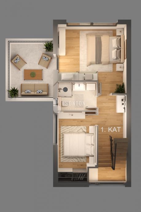 PRVI KAT : Dvije spavaće sobe s kupaonicom i hodnikom 39,04 m2 plus vanjska terasa 15,50m2