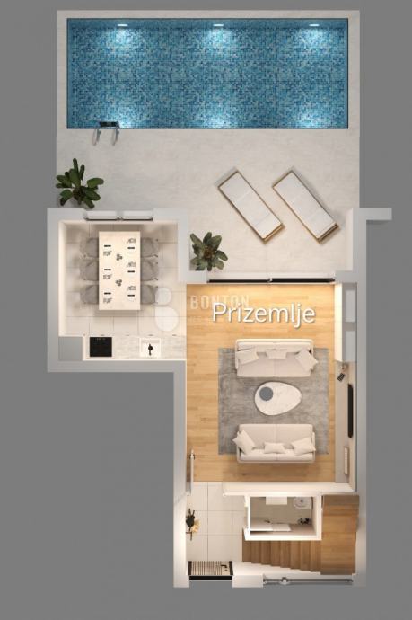Sastoji se od Prizemlja s izlazom na vanjski bazen i vrt. U prizemlju nalazi se Open space Blagovaona s kuhinjom i Dnevnim boravkom