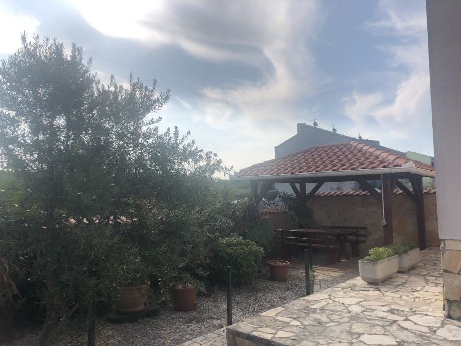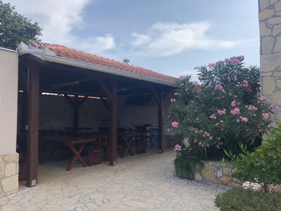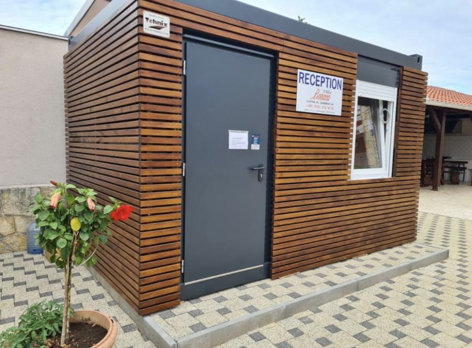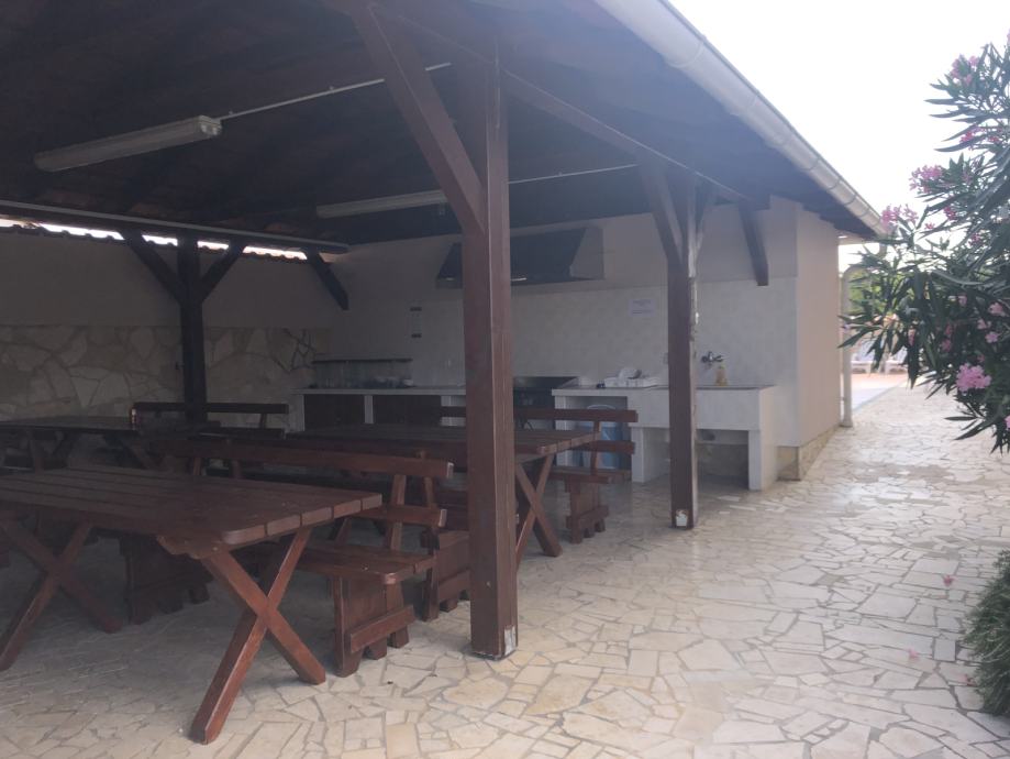 U dvorištu objekta nalazi se recepcija za prijem gostiju, bazen sa strojarnicom, dva vanjska wc-a, manja natkrivena terasa i veća natkrivena terasa s vanjskom kuhinjom.