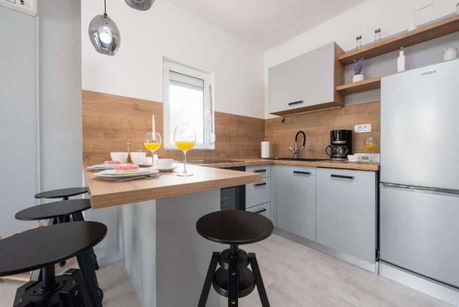 Svaki stan sastoji se od ulaznog hodnika, dvije elegantno uređene spavaće sobe s ugradbenim ormarima po mjeri, moderne kupaonice te kuhinje povezane s blagovaonicom i dnevnim boravkom u otvorenom konceptu. Kuhinje su opremljene kvalitetnim aparatima i šankom za objedovanje, dok dnevni boravci imaju izlaz na natkrivene terase – savršene za jutarnju kavu ili večernje opuštanje uz čašu vina.