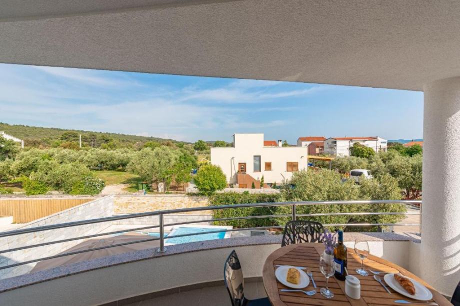 S kata se pruža lijep, otvoren pogled na more, marinu i zelenilo koje okružuje nekretninu, što dodatno naglašava mediteranski ugođaj.