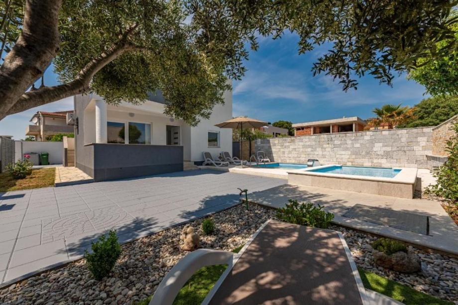 Posebnu vrijednost ove vile daje pažljivo uređena okućnica. Prostrano popločano dvorište krasi veliki bazen s modernim slapom i ambijentalnom LED rasvjetom koja navečer stvara impresivan vizualni dojam. Uz bazen se nalazi i odvojeni jacuzzi za dodatno uživanje. Ležaljke, sunčalište i natkrivena terasa omogućuju potpuni komfor i privatnost.