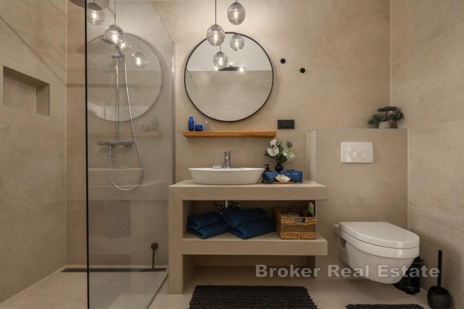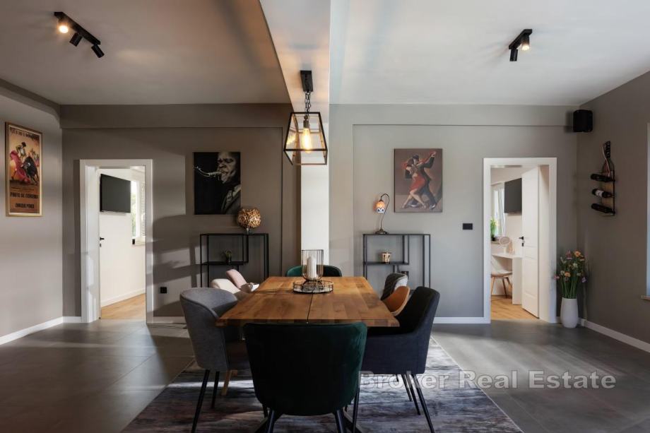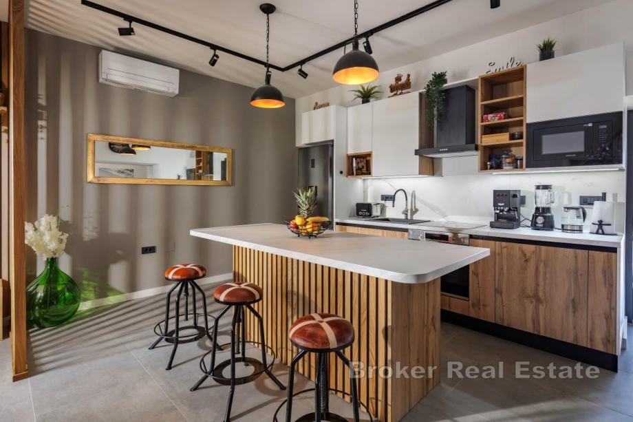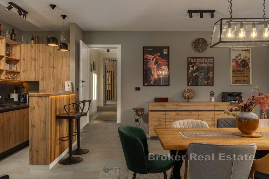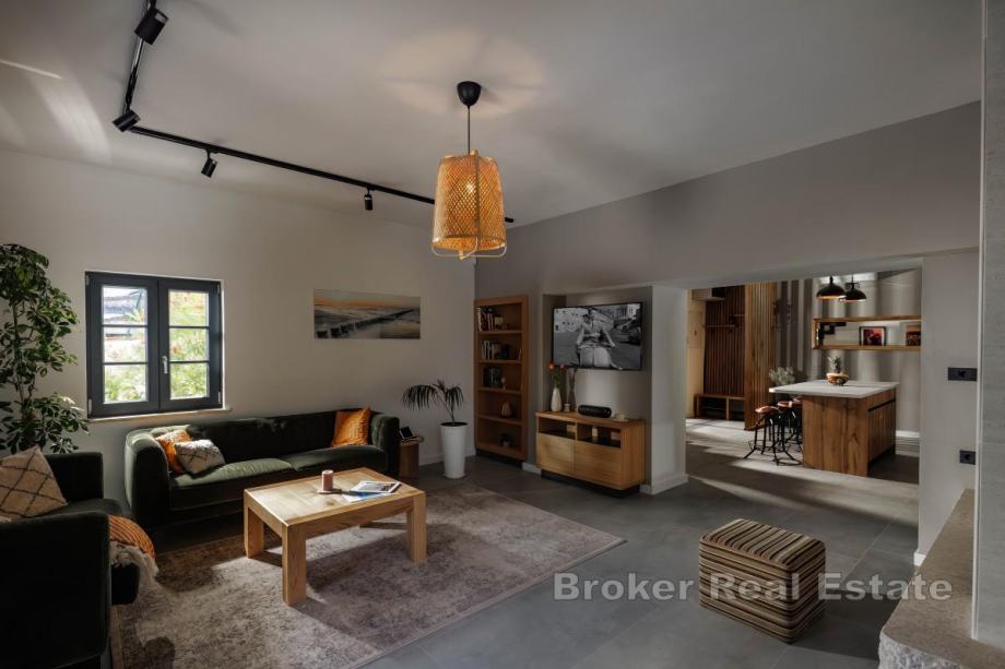 Sastoji se od dnevnog boravka u čijem se nastavku nalaze kuhinja s otokom i blagovaonica, četiri spavaće sobe s vlastitim kupaonama te toaleta za goste. Interijer je jedinstveno i besprijekorno uređen.