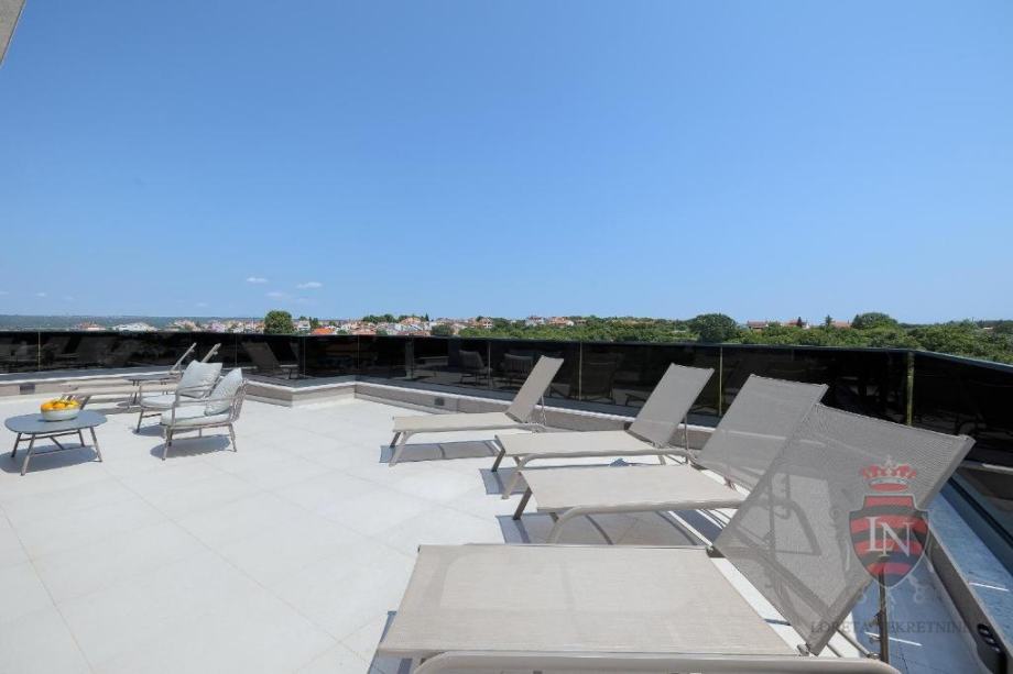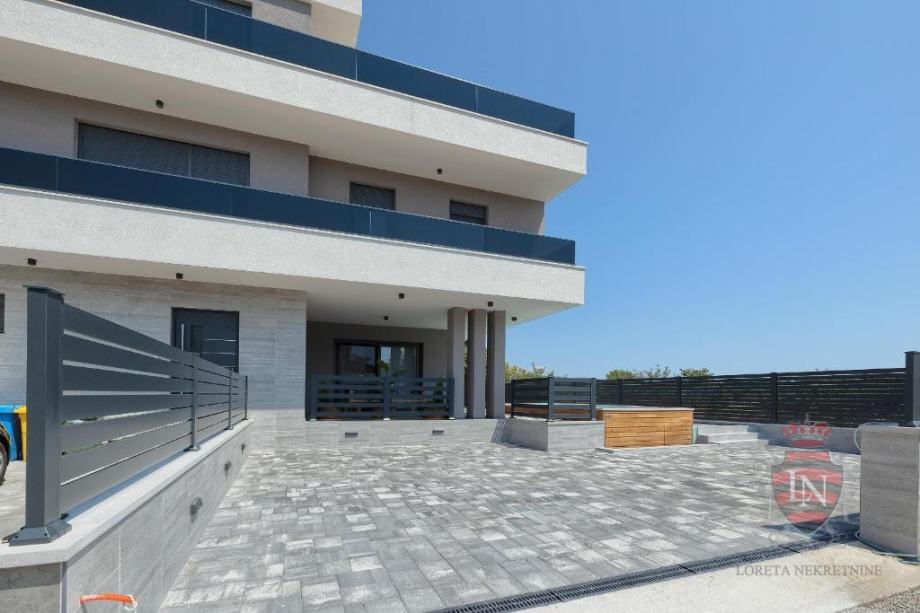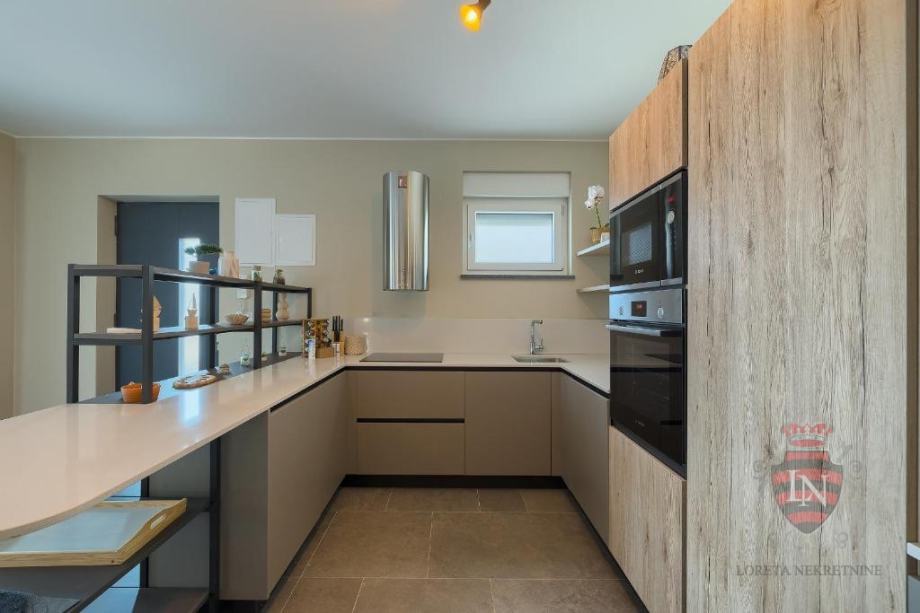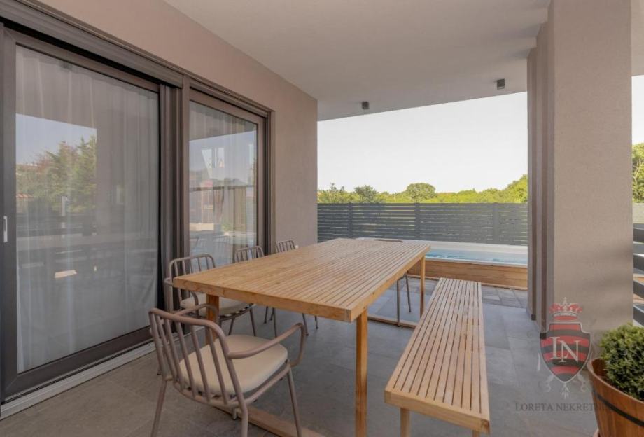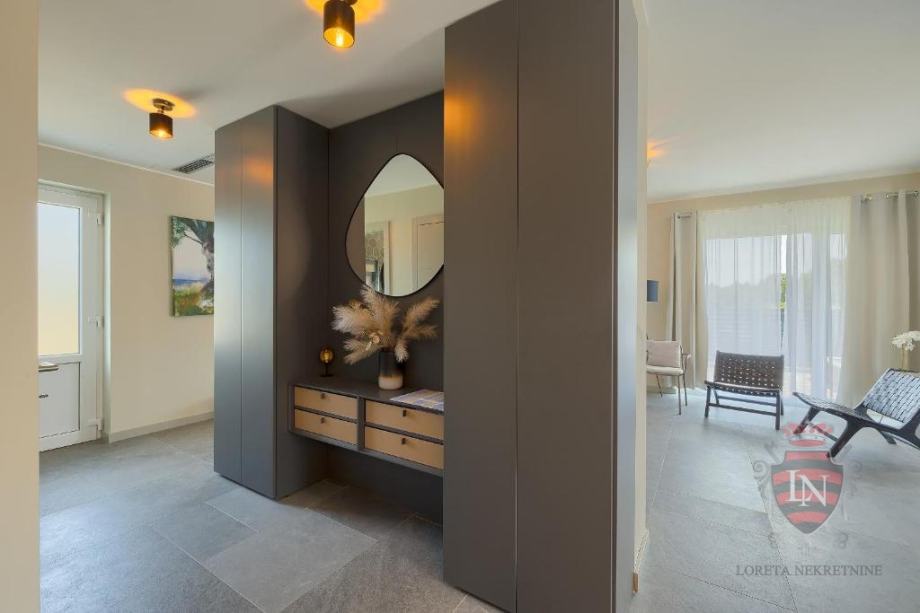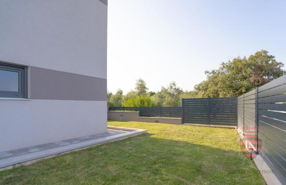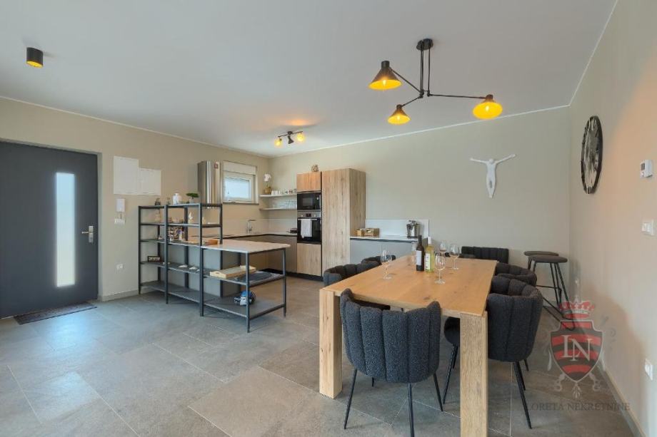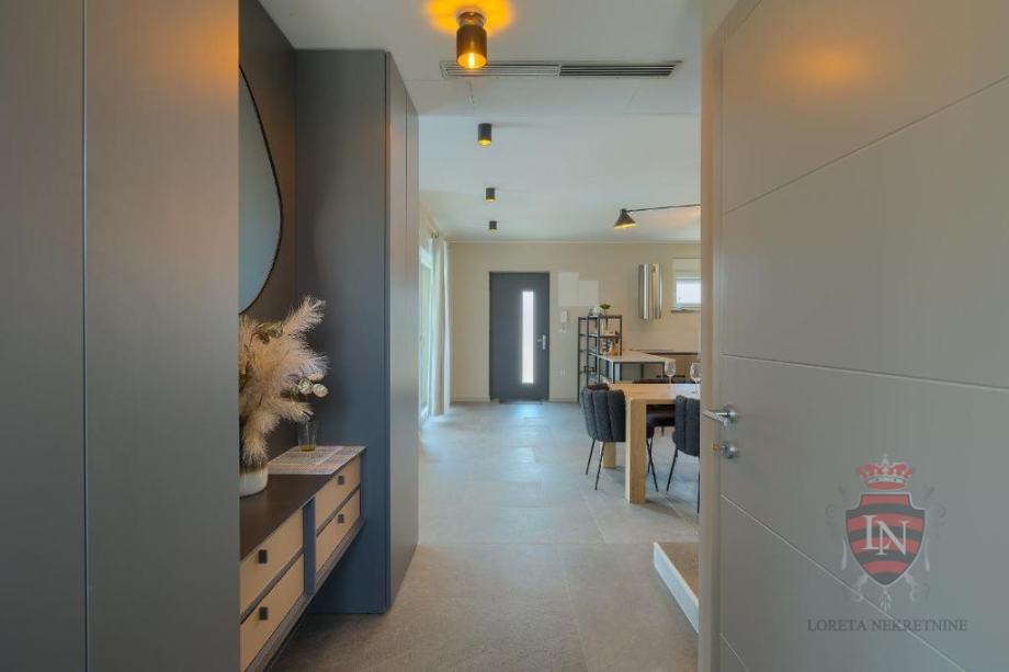 Grijanje je podno. U prizemlju se nalazi kupaonica, spremište, kuhinja i veliki dnevni boravak. Na to se nadovezuje natkrivena terasa. Sa lijeve strane je vrt i grijani bazen.