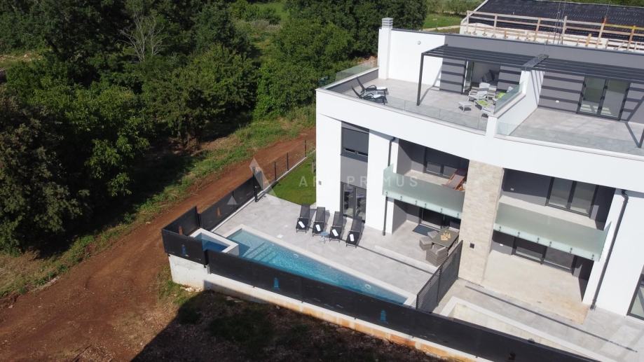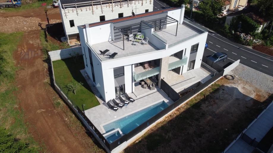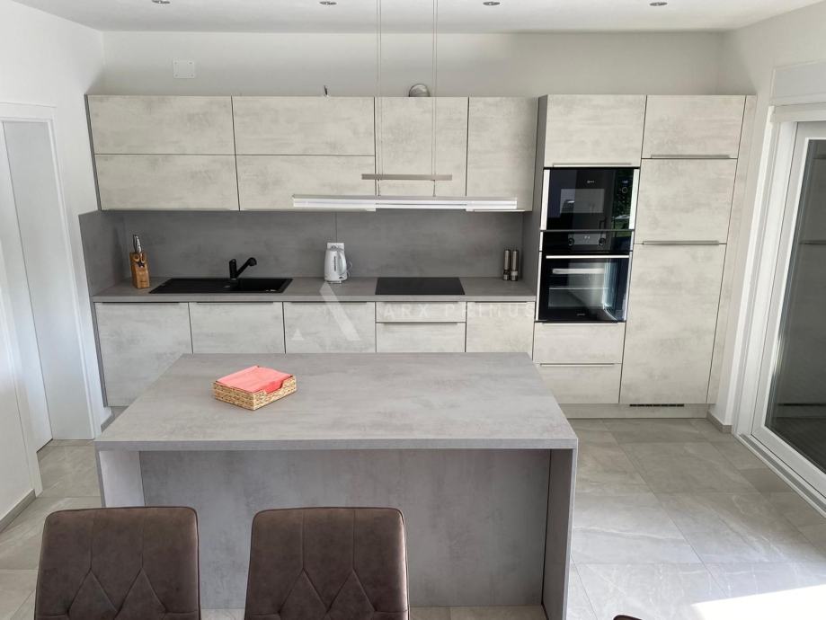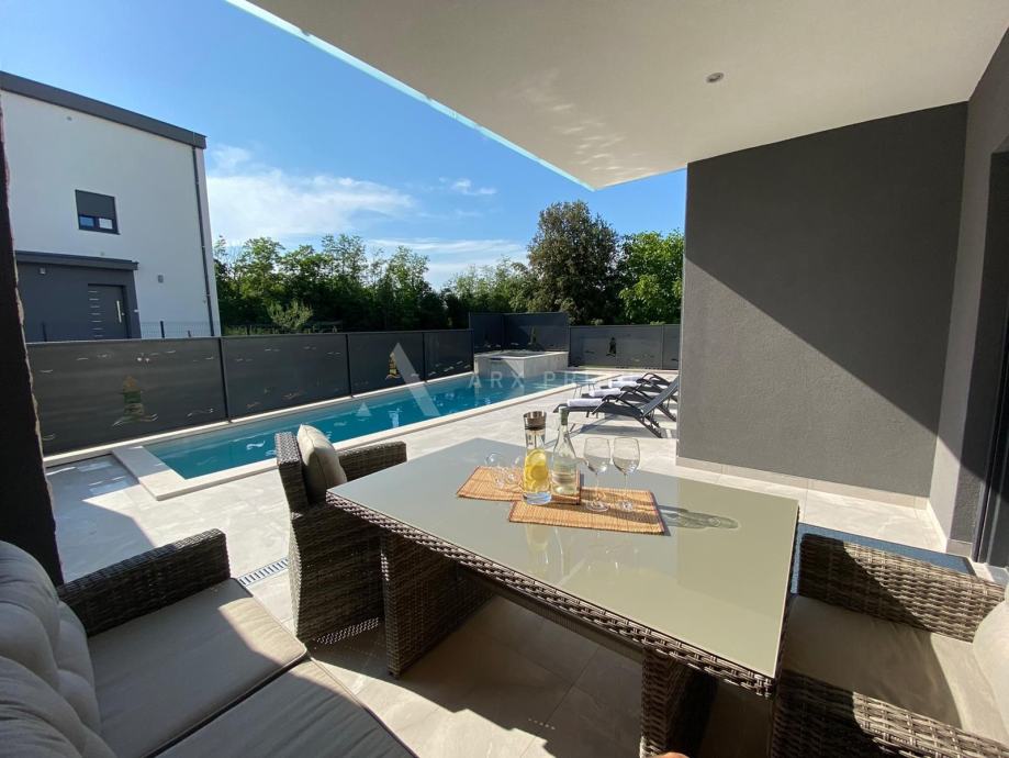 Prizemlje čine predsoblje, dnevni boravak sa blagovaonicom, kuhinja, kupaonica, ostava i prostrana natkrivena terasa s koje se izlazi na uređeno dvorište s bazenom.