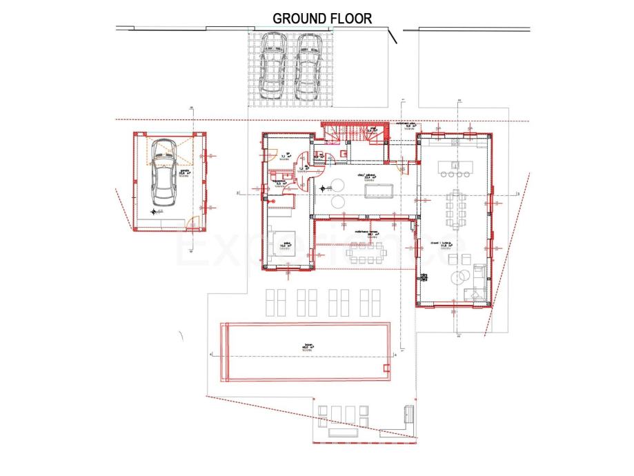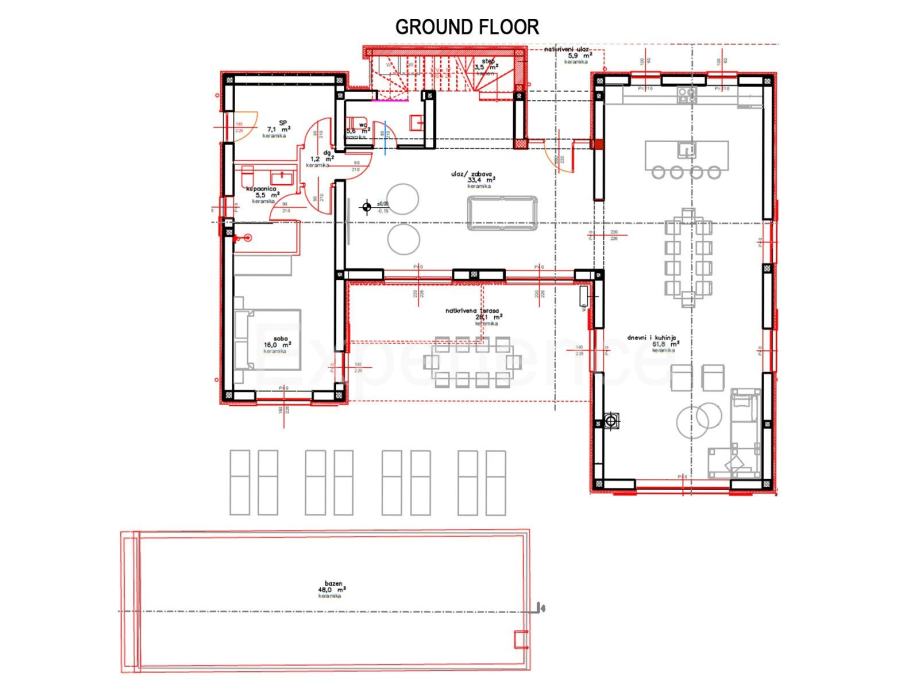 U prizemlju nalazi se prostrani dnevni boravak (33,40 m²) s izlazom na bazen, luksuzno osmišljen otvoreni prostor koji objedinjuje modernu kuhinju, elegantnu blagovaonicu i dodatni dnevni boravak s direktnim pristupom natkrivenoj terasi (28,10 m²). Ova etaža također sadrži spavaću sobu sa vlastitom kupaonicom, tehničku sobu, praonicu rublja i gostinjski toalet.