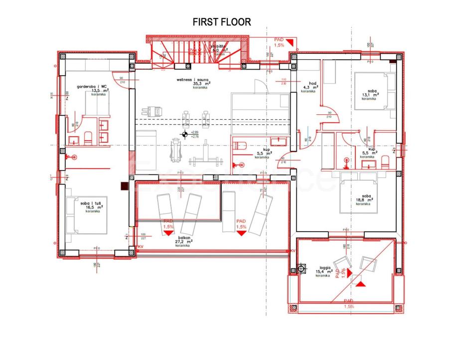Na prvom katu nalazi se wellness sa saunom savršen prostor za opuštanje, tri prostrane spavaće sobe, svaka sa vlastitom kupaonicom i izlazom na balkon.