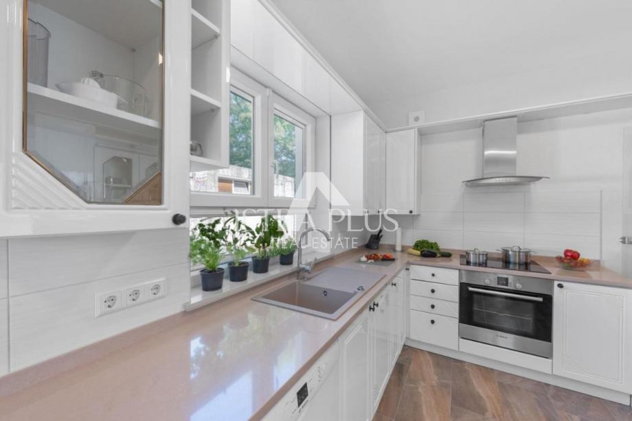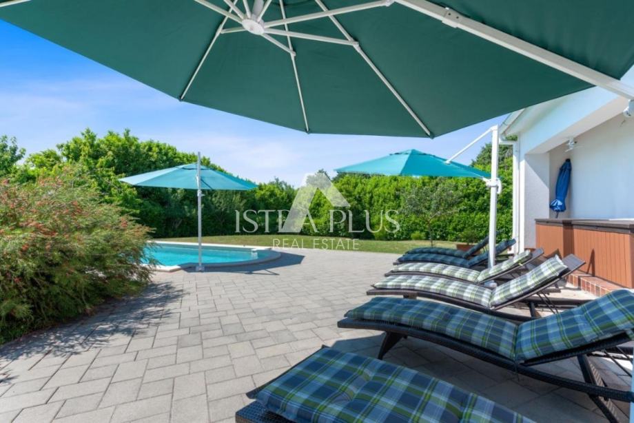U prizemlju se nalazi hodnik, kuhinja, blagovaonica, dnevni boravak, kroz koji se izlazi na lijepo sunčalište s Jacuzzijem i grijanim bazenom.