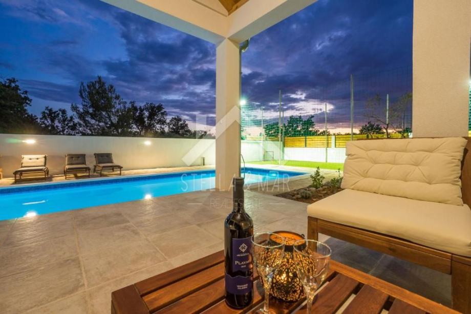 Prodaje se novoizgrađena vila sa bazenom mediteranskoga stila u Zatonu. Smještena je na mirnoj lokaciji, u neposrednoj blizini centra sa svim potrebnim sadržajima za život i turizam. Također, predivna plaža udaljena je 500m od objekta.