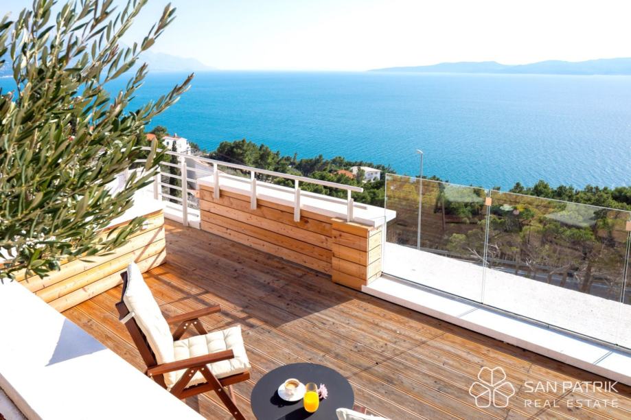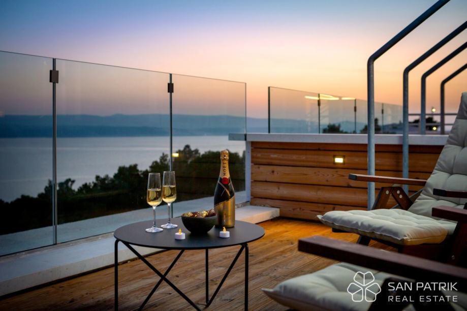 Krovna terasa vile je prostor koji se pamti, sa 93 m² otvorenog prostora, uključujući ljetnu kuhinju s roštiljem, stolom za blagovanje i sve što je potrebno za uživanje u vanjskim obrocima s pogledom na more. Dvije bioklimatske pergole pružaju zaštitu i stvaraju atmosferu idealnu za druženje s obitelji i prijateljima.
