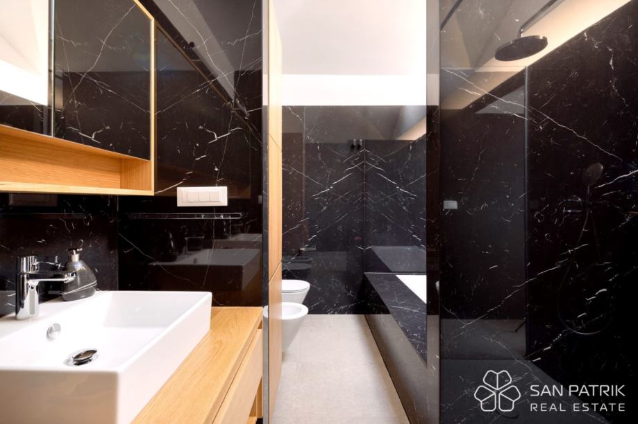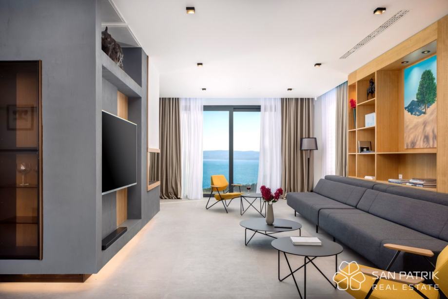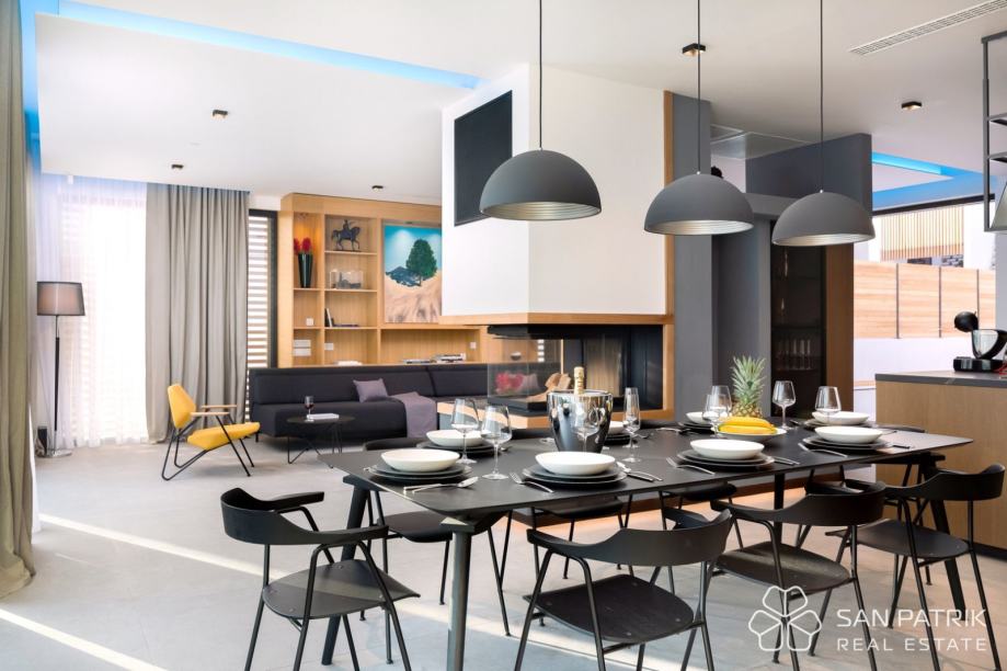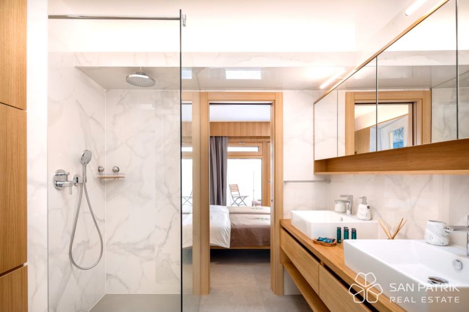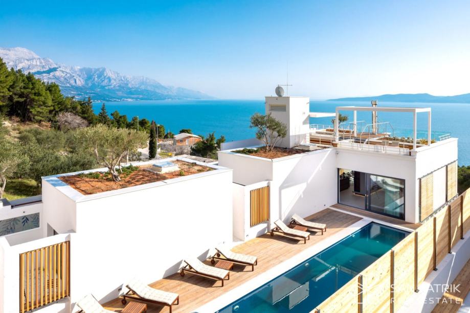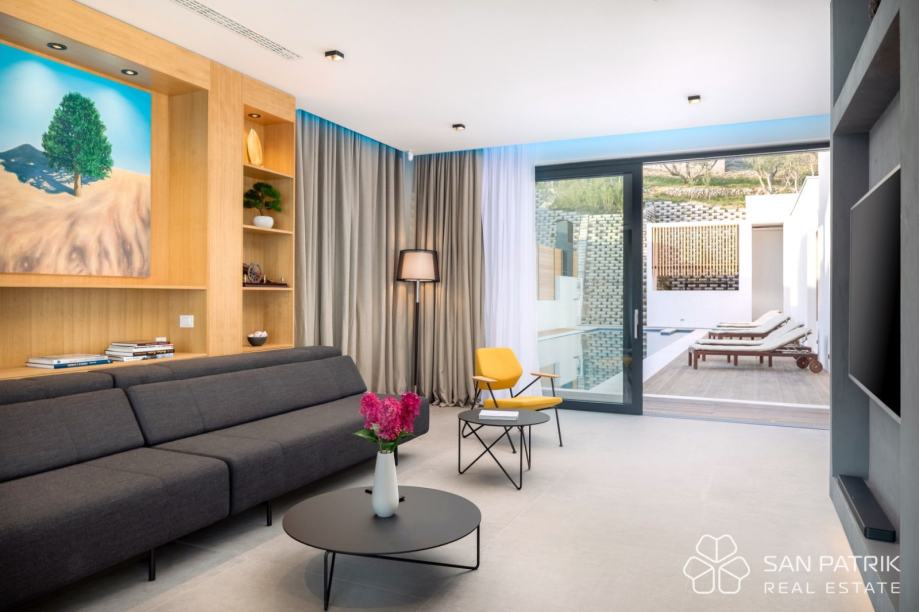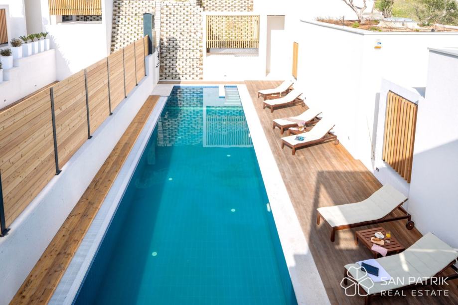 Drugi kat otkriva raskošan dnevni boravak s modernom kuhinjom, dizajniran kako bi se maksimalno iskoristila prirodna svjetlost i pružio izravan pristup veličanstvenom bazenu od 66 m². Bazen, zajedno s hidromasažnom klupom i prostranim područjem za sunčanje, pravo je mjesto za opuštanje ili zabavu. Tri prostrane spavaće sobe, svaka s vlastitom en-suite kupaonicom i terasom, jamče privatnost i ekskluzivitet.